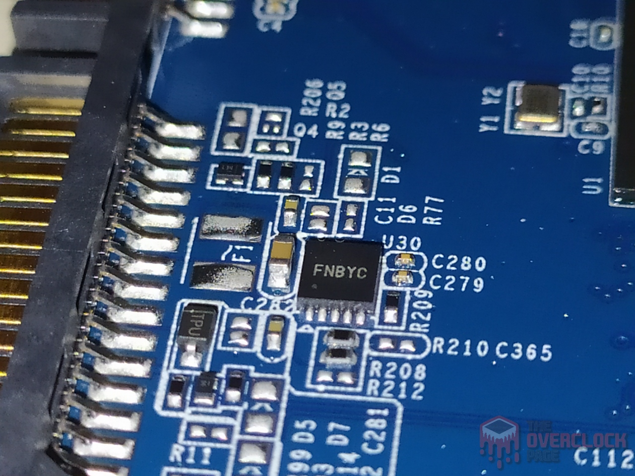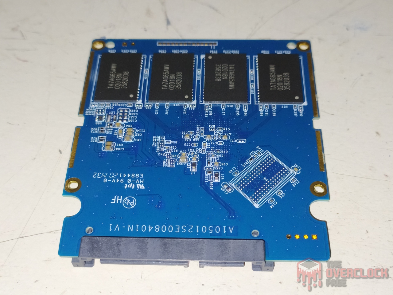 Vemos que em seu PCB frontal, temos o seu controlador junto de uma DRAM Cache e mais 4 módulos NAND Flash, já no seu lado traseiro do PCB encontramos mais 4 módulos NAND Flash.