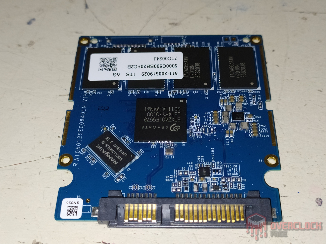 Neste SSD, podemos observar que ele acompanha um controlador da Phison, que a Seagate remarcou como “STXZA01F5578“, sendo ele um controlador topo de linha para SSDs SATA, o Phison S12 “PS3112-S12, que se trata de um modelo ARM 32-bit Quad-core que trabalha com um clock aproximadamente de 667 MHz, costumando ser encontrado em SSDs topo de linha e de ramo corporativo como o Kingston DC500R e até mesmo outros SSDs Seagate.