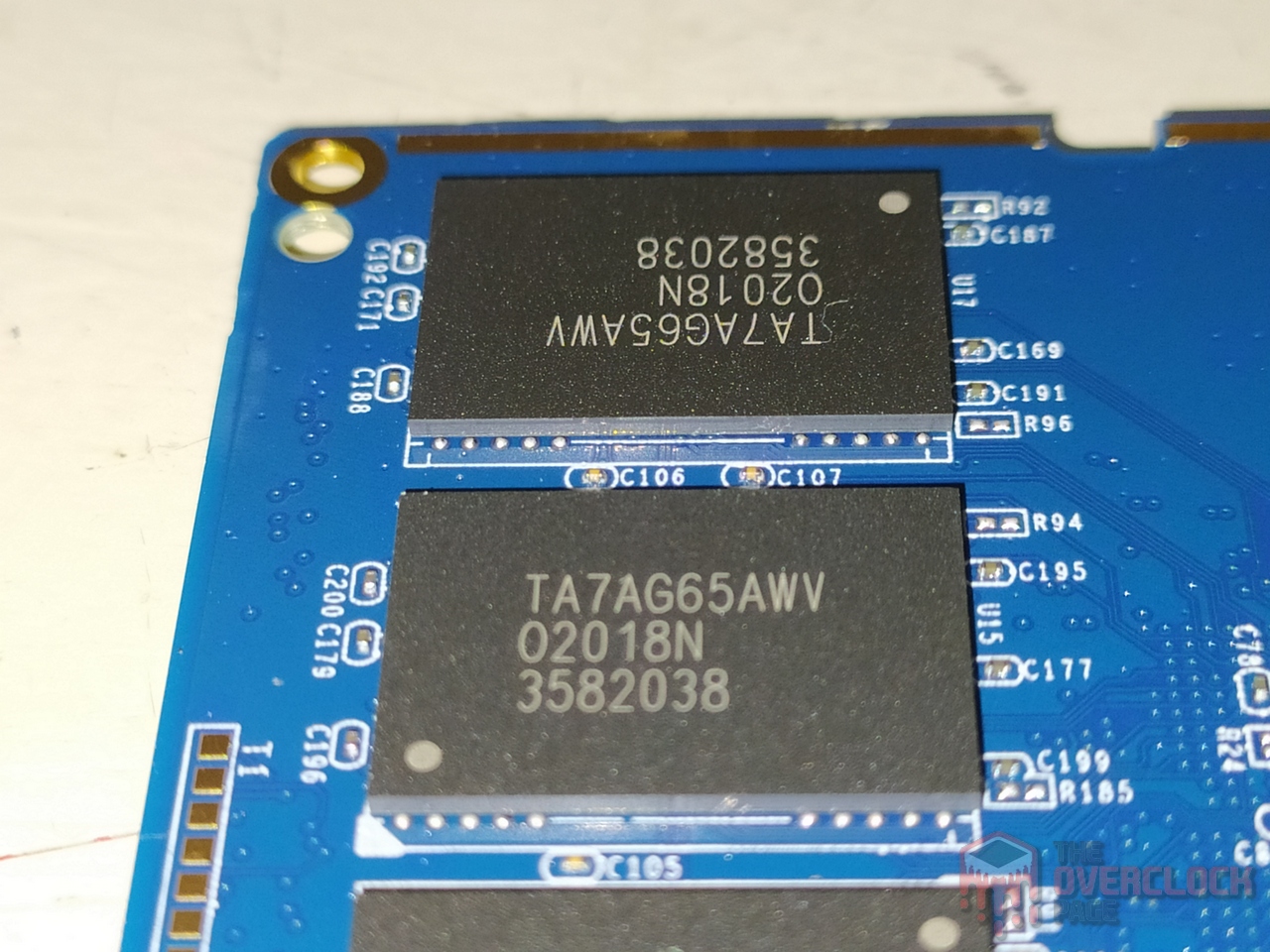 Com relação a seus circuitos integrados de armazenamento, o SSD de 1TB possui 8 chips Nand flashs marcados como “TA7AG65AWV”. Tratam-se de Nands da fabricante Japonesa Kioxia, sendo neste caso dies de 256Gb (32GiB) contendo 96-Layers de dados sendo um total de 109-layers gerando uma “Array Efficiency” de 88.1%.
