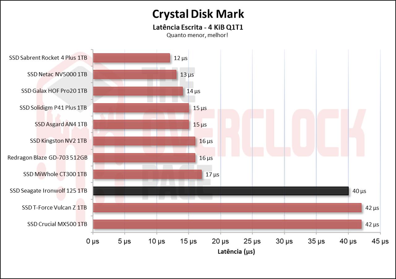 Podemos observar que o Seagate apresenta resultados bem semelhantes aos demais SSDs SATA deste comparativo, porém, nestes testes sintéticos, todos os SSDs SATAs ficam muito atrás dos demais NVMes do comparativo.