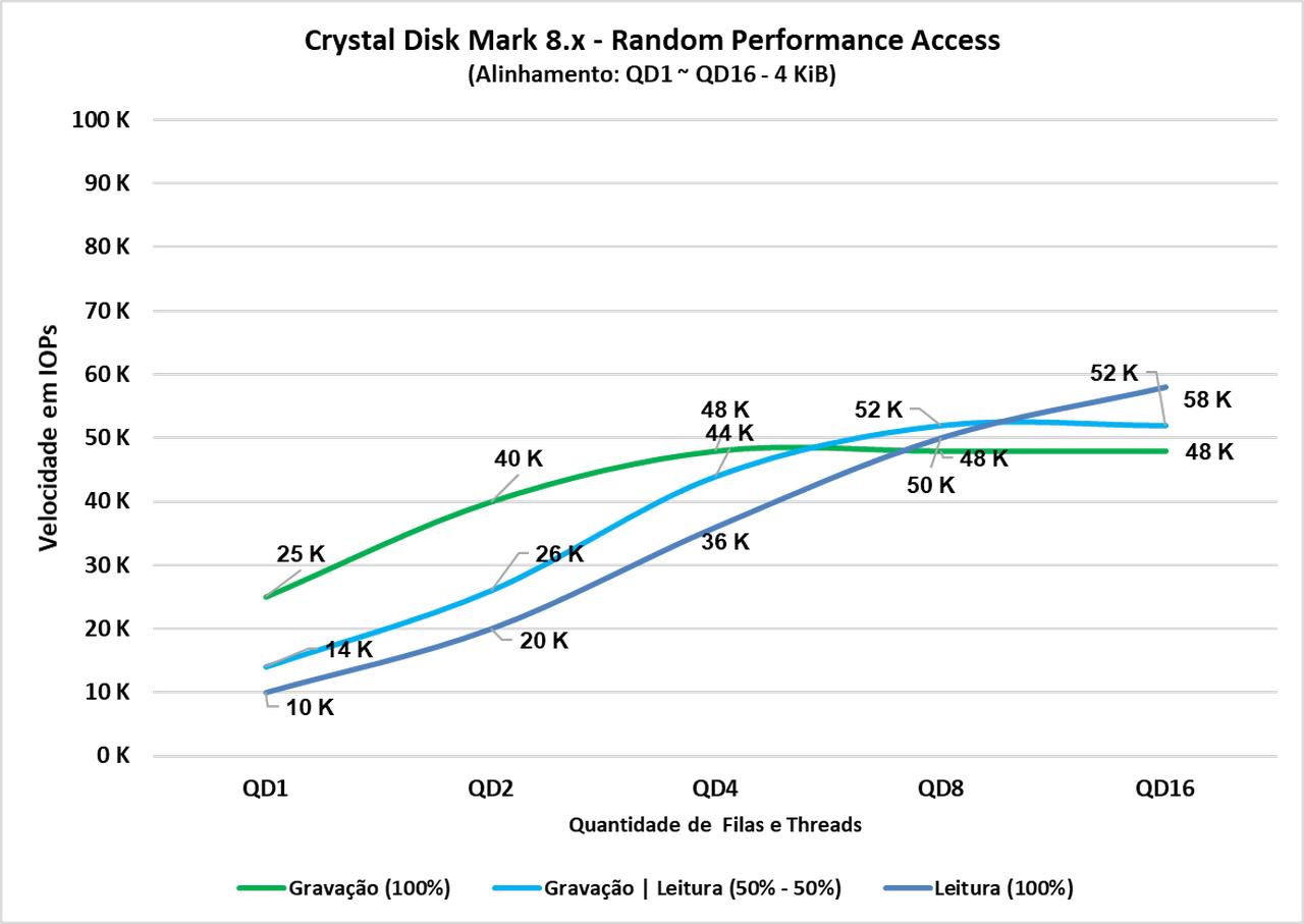 Neste teste, foram feitas 3 configurações de acessos entre diversas configurações de queue depth desde QD1, que representa um uso cotidiano do dia a dia, quanto QD16, que já se torna bem surreal, mais comparável com ambientes virtualizados.