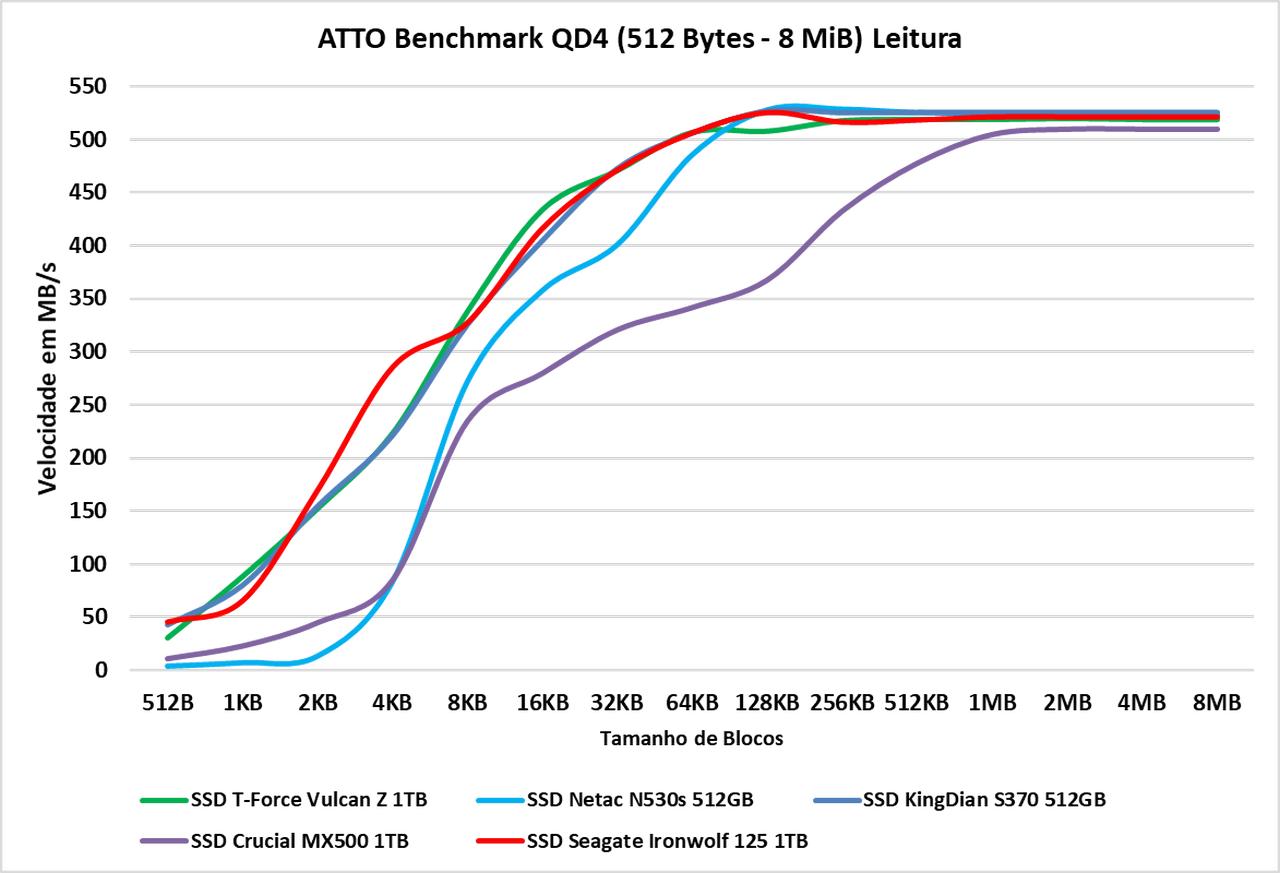 Realizamos um teste utilizando o ATTO para observar a velocidade dos SSDs em determinados tamanhos de blocos diferentes. Neste benchmark, foi configurado da seguinte forma: