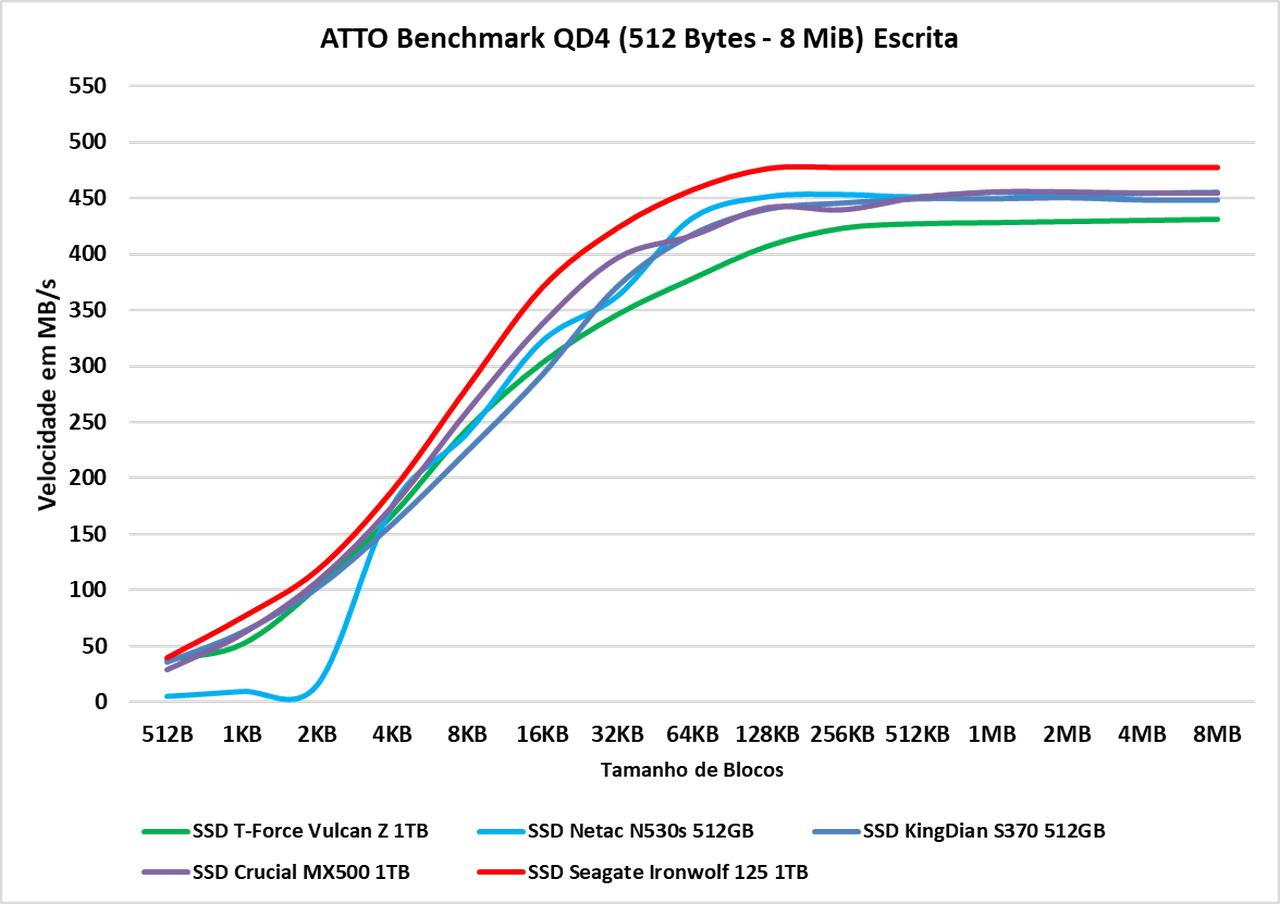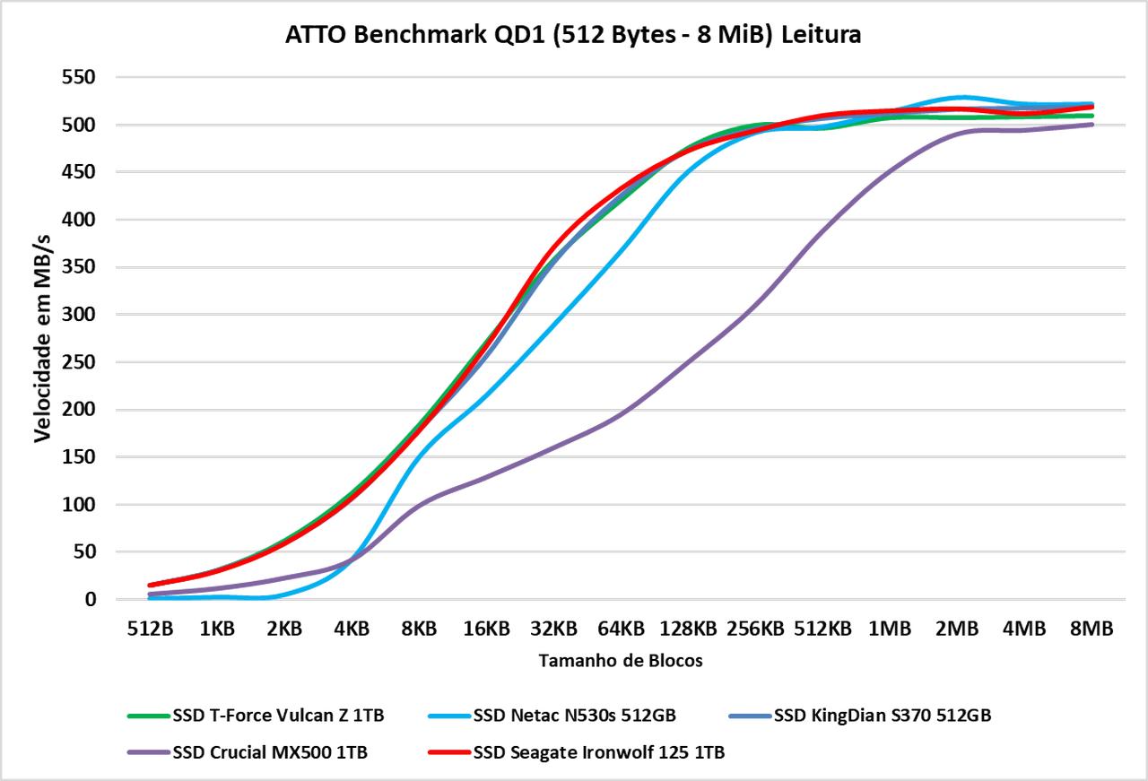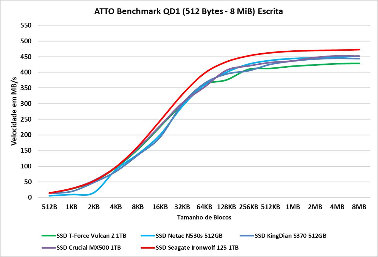 O ATTO disk benchmark é um software que faz um teste de velocidade sequencial com arquivos comprimidos, ou seja, para uma simulação em uma carga de transferência de dados como no Windows, geralmente vemos algo em torno dos blocos de 128KB à 1 MiB, vemos que eu em sua escrita, ele acaba se saindo a frente de todos os demais SSDs SATs, apenas em sua leitura que ficou semelhante aos demais.