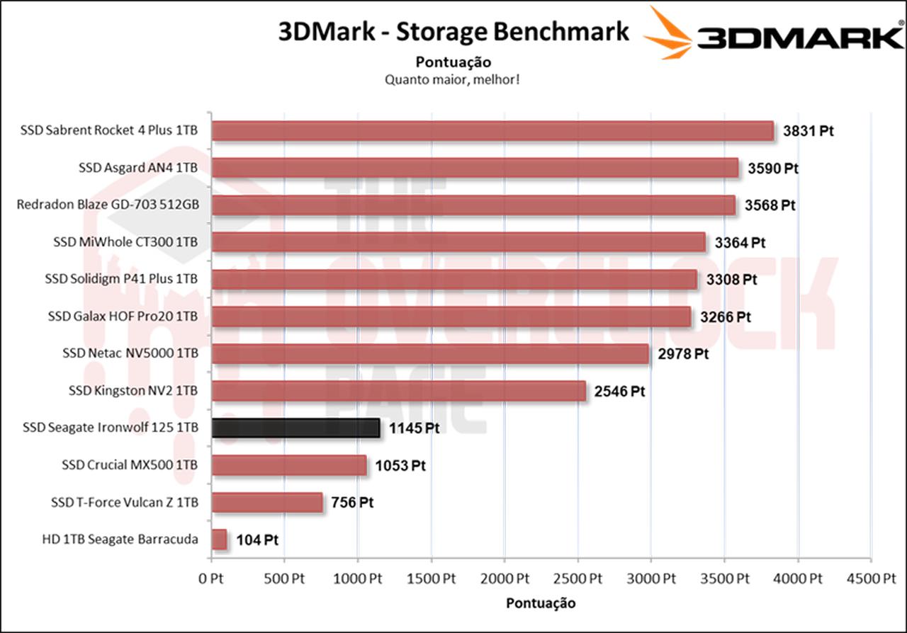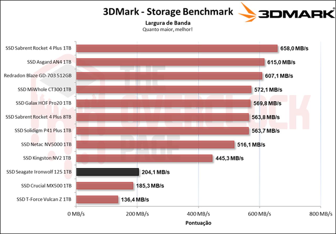 Ao utilizarmos o 3DMark que é uma excelente ferramenta que possui diversos traces bem realísticos e comuns do dia a dia. Podemos observar que, o Seagate foi o SSD sata com o melhor desempenho do comparativo dentre os demais SSDs de 6Gbps.