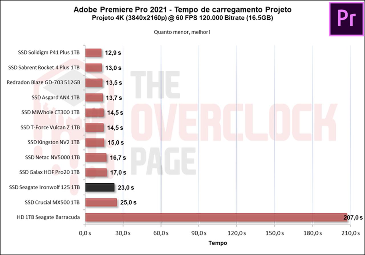A seguir, utilizamos o Adobe Premiere para medir o tempo médio de abertura de um projeto de cerca de 16.5GB com resolução 4K, 120Mbps de bitrate, cheio de efeitos até que estivesse pronto para edição. Ressaltando apenas que o SSD testado é sempre como drive secundário sem o sistema operacional instalado, pois isso poderia afetar o resultado, gerando inconsistências.