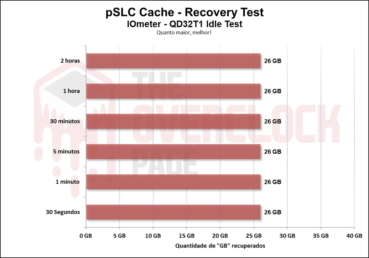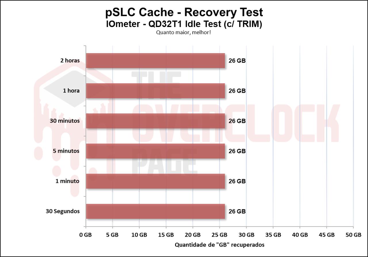 Realizamos também um teste para ver quanto tempo o SSD levaria para recuperar parte de seu Buffer e, no decorrer da nossa bateria de testes, que vai de 30 segundos até 2 horas em idle, utilizando o TRIM e gargabe collection vs TRIM/GC não utilizados. Ao testar sem utilizar o TRIM, podemos observar que o SSD conseguiu recuperar seu volume inteiro tendo em vista ser um volume bem pequeno.