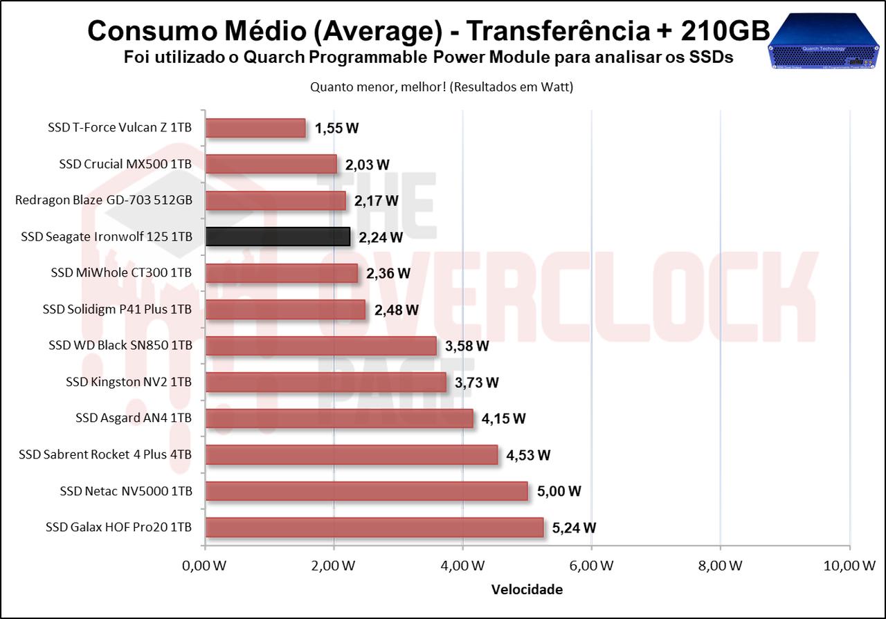 Durante a transferência de mais de 210GB de arquivos vemos que ele teve um consumo um pouco maior que o MX500 mas em atividades do cotidiano não chega a ser algo preocupante.
