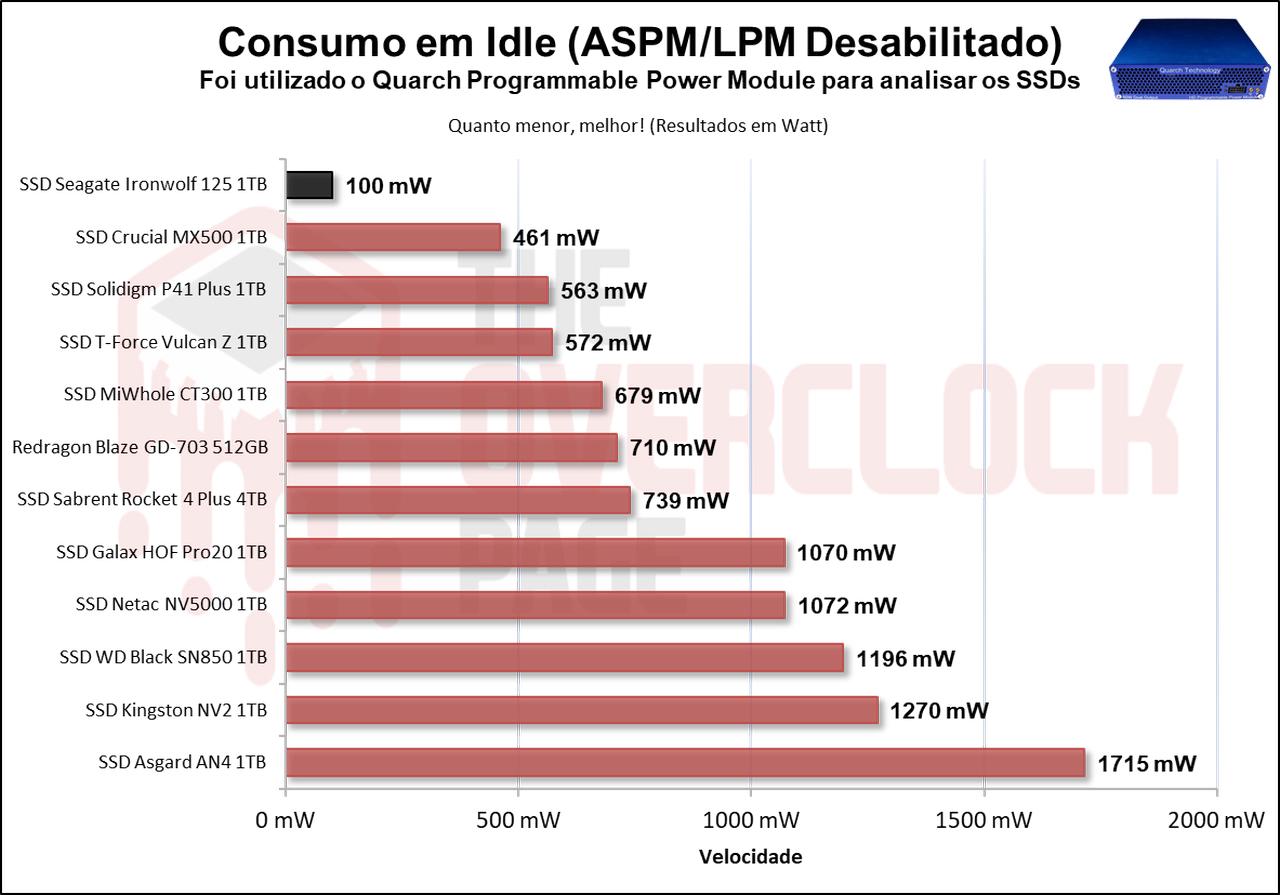 Por último e mais importante, teste em Idle, sendo o cenário em que a esmagadora maioria dos SSDs se encontram no uso do dia a dia ou cotidiano, vemos que ele acabou destruindo a competição tendo incríveis 100mW de consumo.