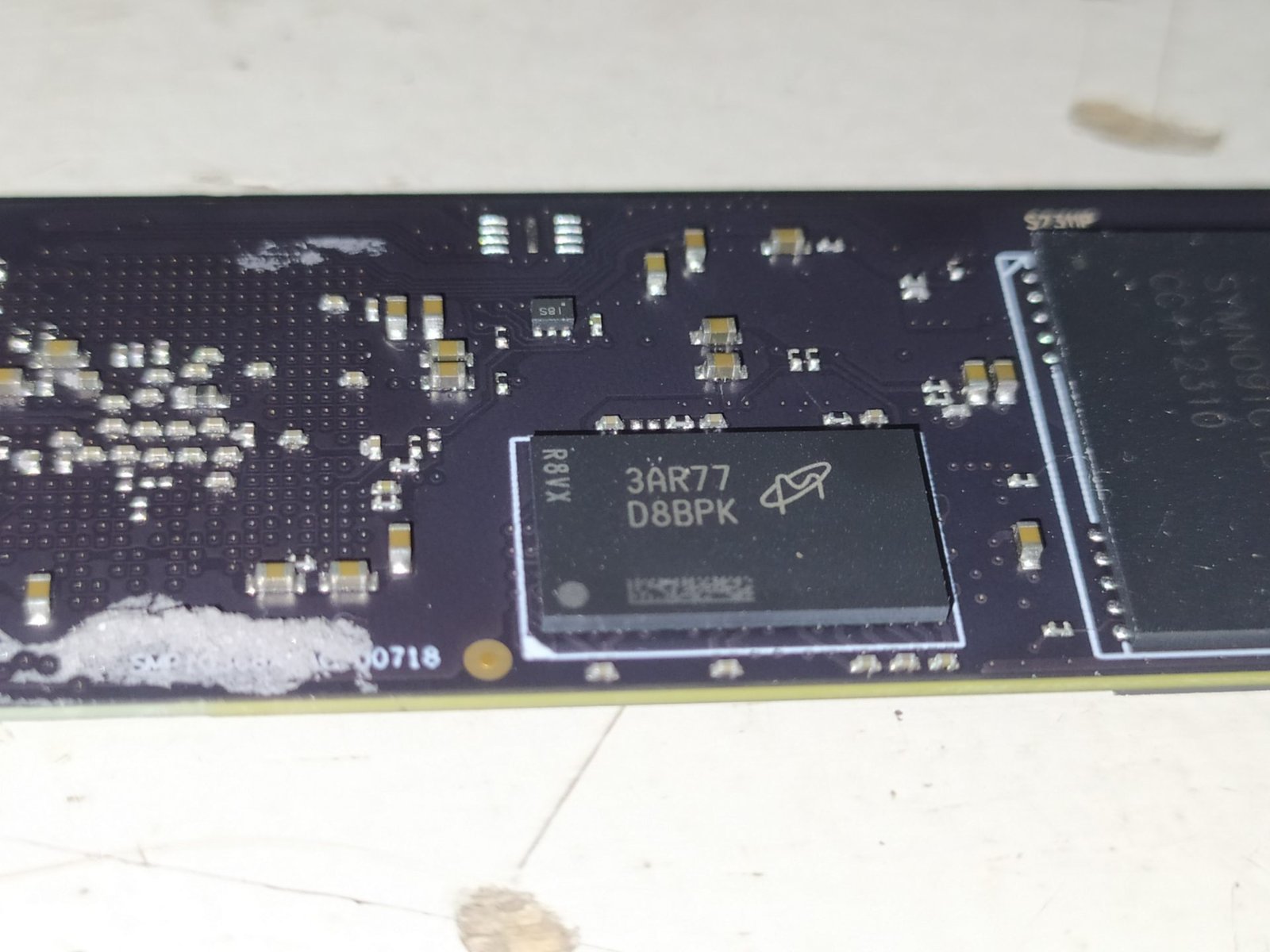 Notamos que este SSD utiliza 2 módulos de DRAM Cache da fabricante Micron modelo D8BPK que ao utilizar o decoder da própria fabricante temos modelos “MT40A512M16TB-062E:R“. Aonde cada DRAM Cache possui 8Gb (1 GB) de densidade totalizando 2GB DDR4-3200 MT/s CL22.
