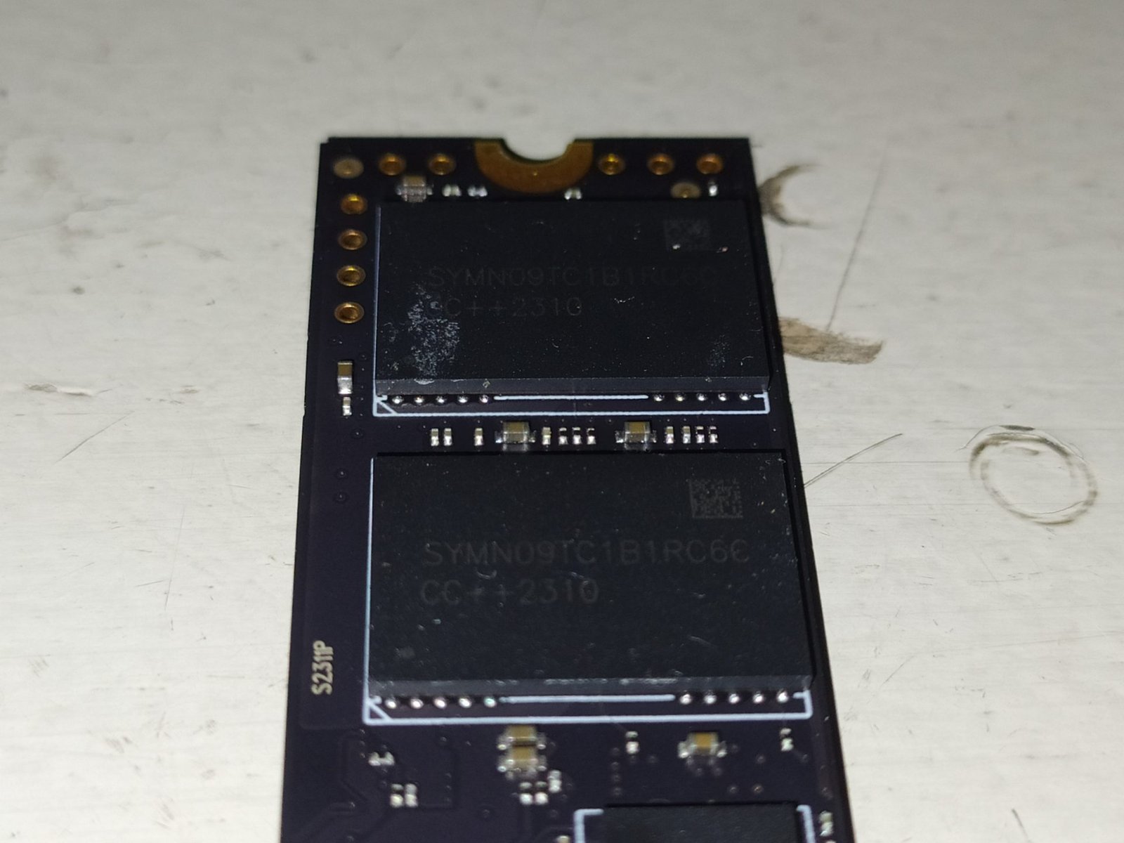 Com relação a seus circuitos integrados de armazenamento, o SSD de 2TB possui 4 chips Nand flash “SYMN09TC1B1RC6C”. Tratam-se de Nands da fabricante chinesa YMTC, modelos CDT1B sendo neste caso dies de 512Gb (64GB) contendo 128-Layers de dados e um total de 141 gates, gerando uma array efficiency de 90,7%, aonde das 141-Layers do SSD, 128 são alocadas para armazenamento o que gera esta eficiência.
