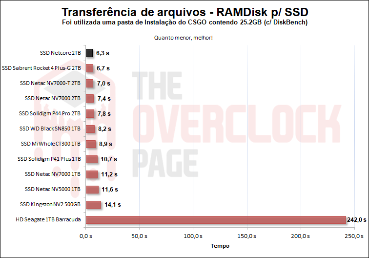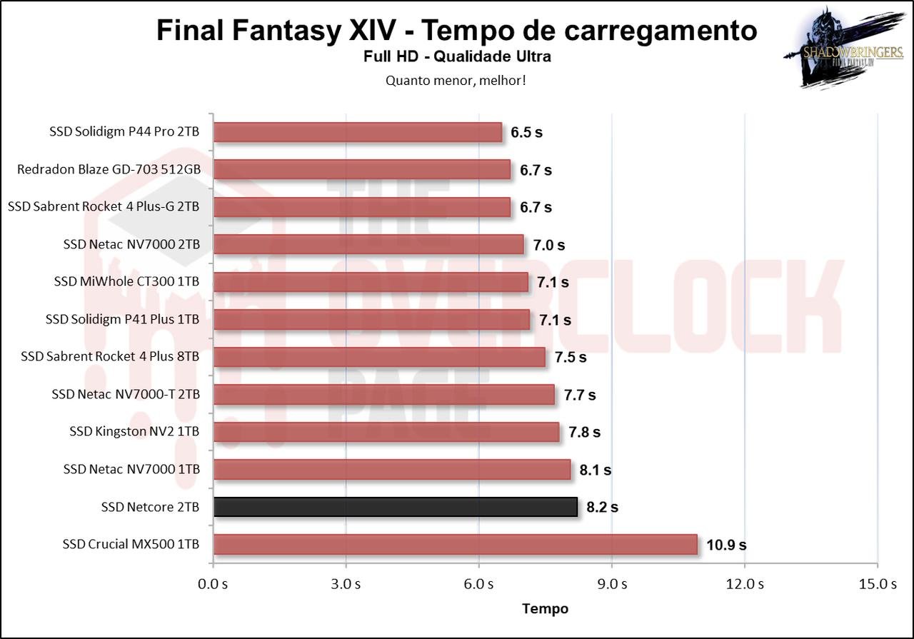 Neste game, vemos que o Netcore levou 8,2 segundos para realizar todas os carregamentos de texturas e cenas do benchmark, o que foi um resultado ok, mas acabou na última posição dos SSDs NVMe, tendo uma diferença ainda maior em games com tempo de carregamento mais demorado.