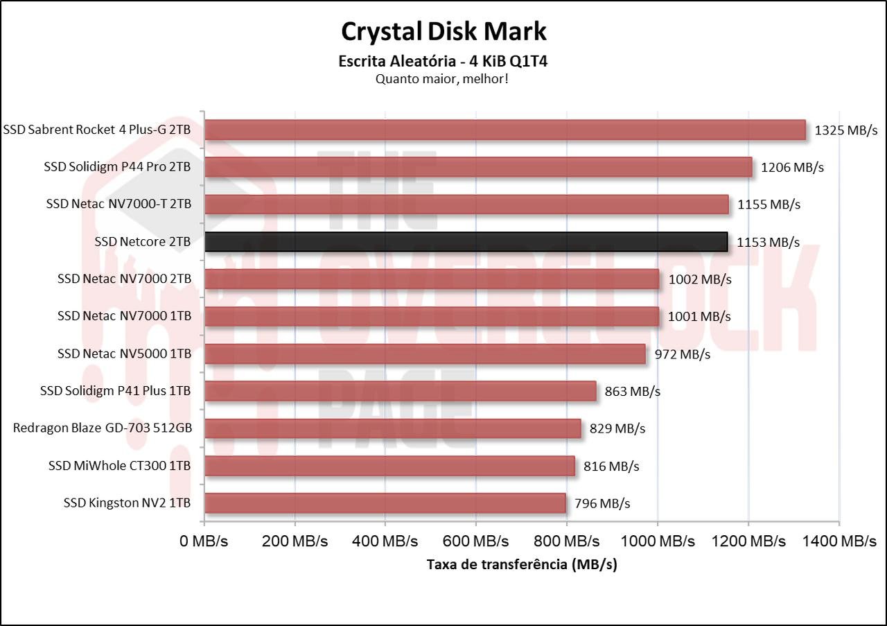 Ao testarmos suas velocidades aleatória em ‘Queue depth’ de 4, observamos que em sua leitura há basicamente um empate técnico com o NV7000 de 1TB com Phison E18 e Micron B47R.