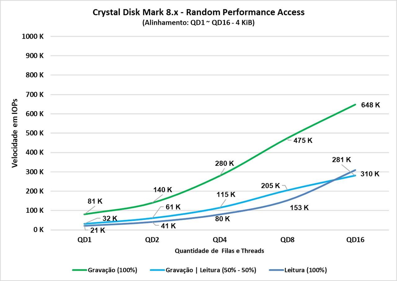 Neste teste, foram feitas 3 configurações de acessos entre diversas configurações de queue depth desde QD1, que representam um uso do dia a dia, quanto QD16, que já se torna bem surreal, mais comparável com ambientes virtualizados.