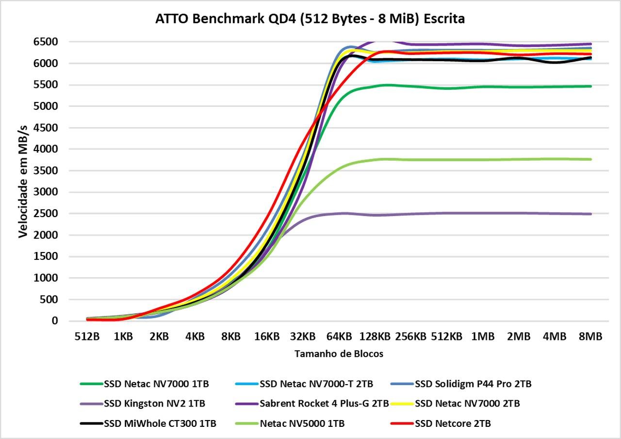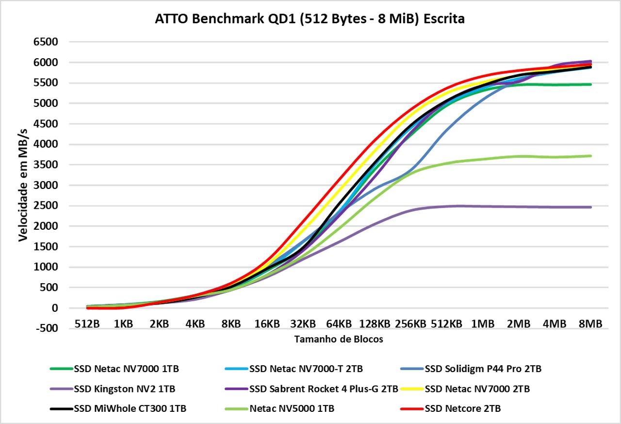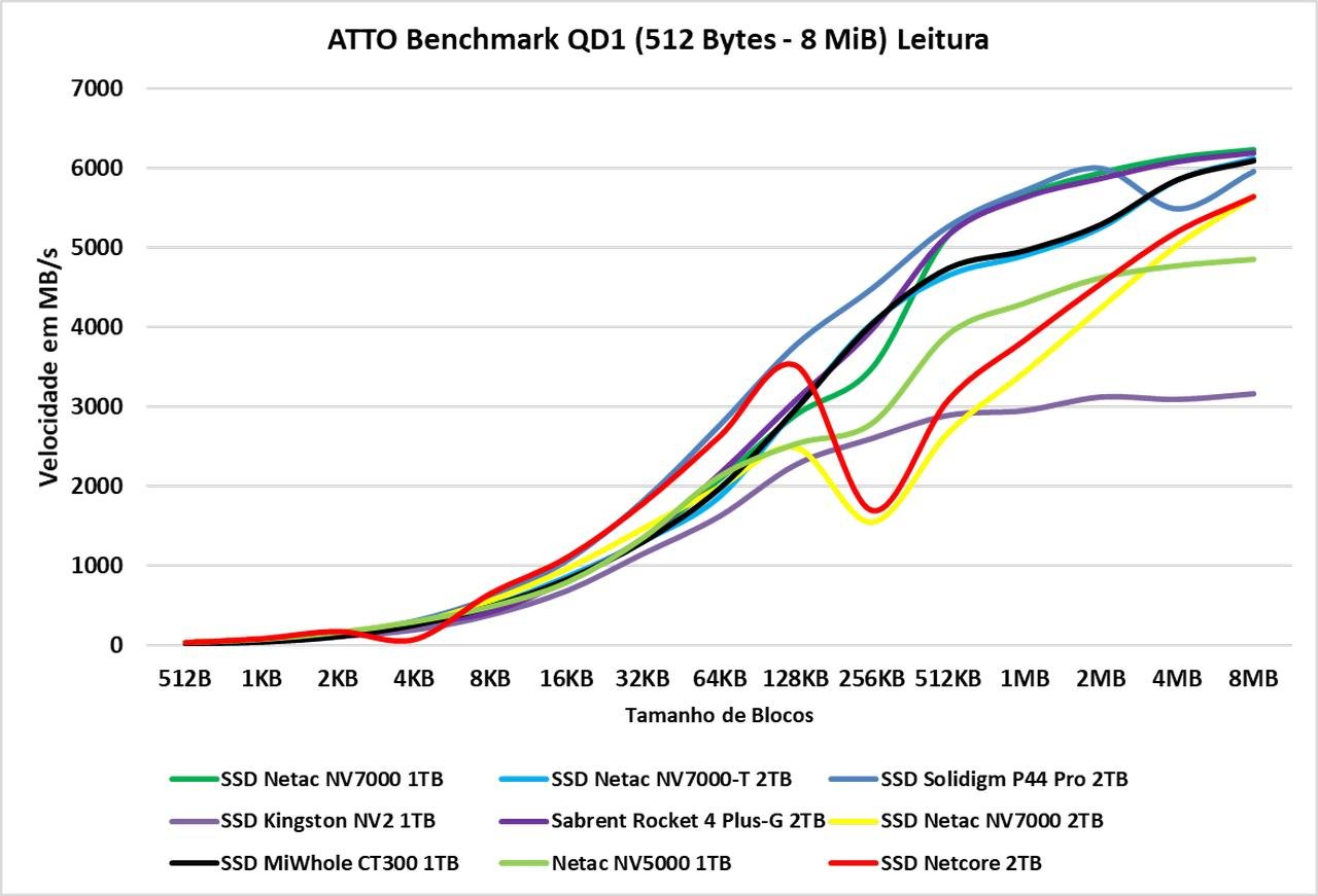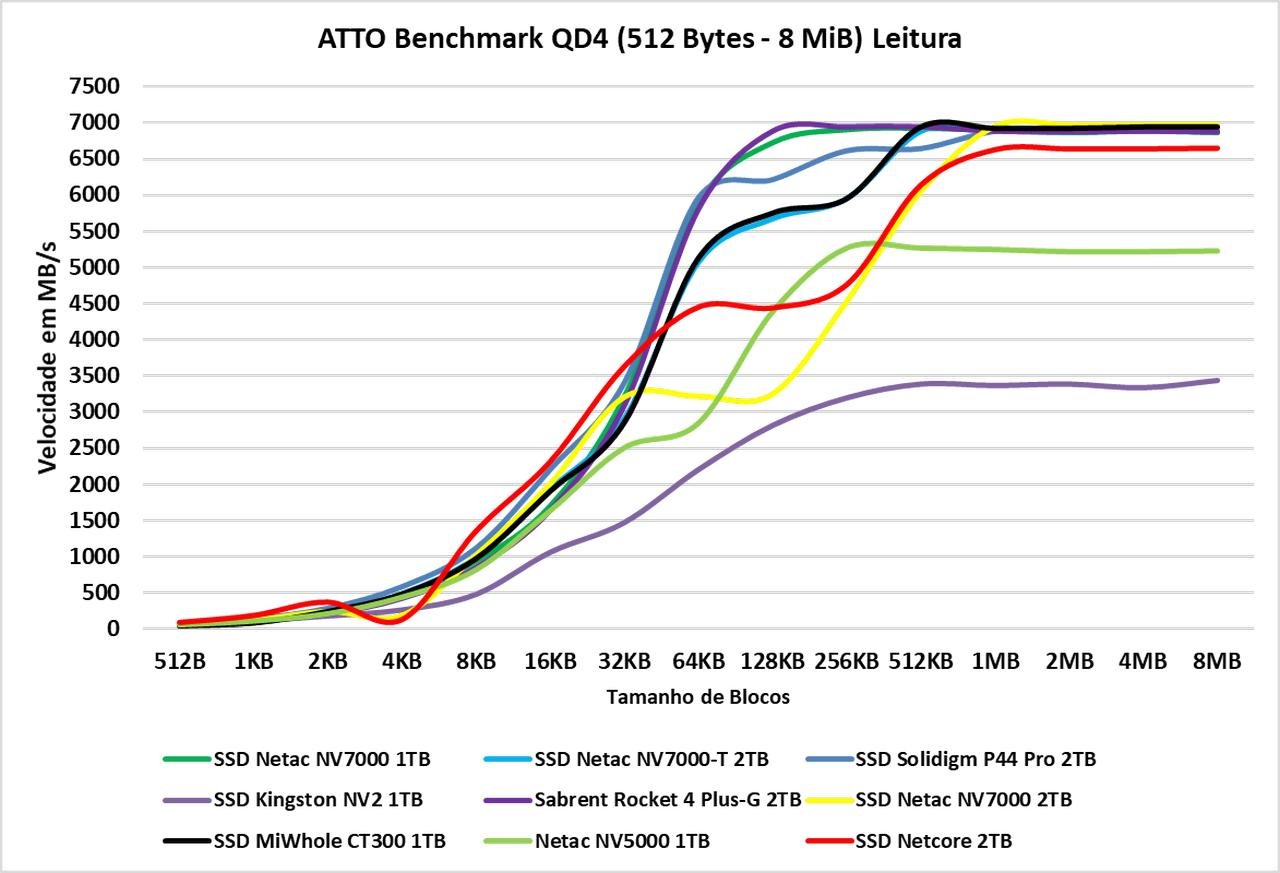 O ATTO Disk Benchmark é um software que faz um teste de velocidade sequencial com arquivos comprimidos, ou seja, para uma simulação em uma carga de transferência de dados como no Windows, geralmente vemos algo em torno dos blocos de 128KB à 1 MiB, agora, na leitura vemos que durante boa parte do final do teste ele acaba se saindo a frente do NV7000 de 2TB.