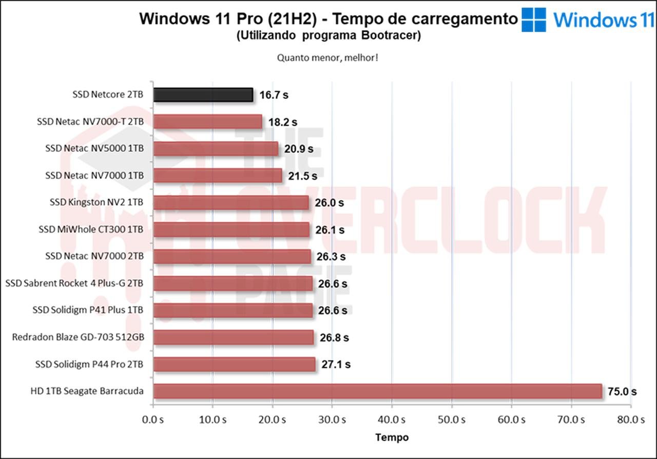 Neste programa, consta deste o tempo de boot até o carregamento dos últimos drivers do OS, o que neste caso, é feito uma instalação limpa com apenas drivers de sistema operacional, como de Rede, Wireless + Bluetooth, Áudio, Drivers Nvidia, PCH dentre outros, então, podemos observar que o Netcore se destacou aqui com o menor tempo de carregamento.