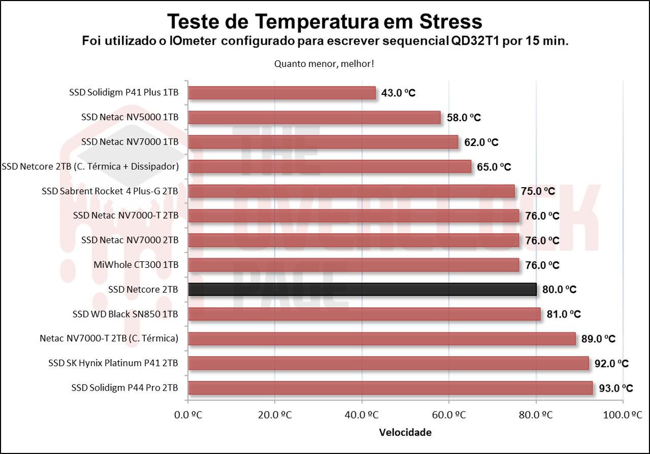 Como visto acima, este SSD por padrão possui um limite de limitação térmica de 120?°C, que é bastante alto, até recomendaria ser diminuído. Entretanto, o SSD nem chegou a esquentar a este ponto, não ultrapassou 80ºC.