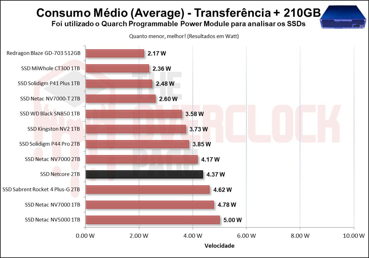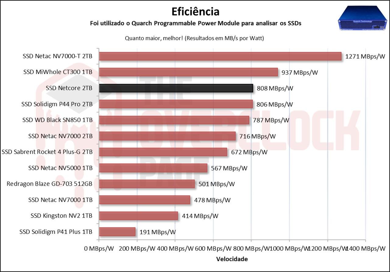De forma impressionante, o SSD conseguiu atingir um nível de eficiência bastante elevado graças ao seu imenso volume de SLC Cache e também pelo fato da sua largura de banda bem elevada.