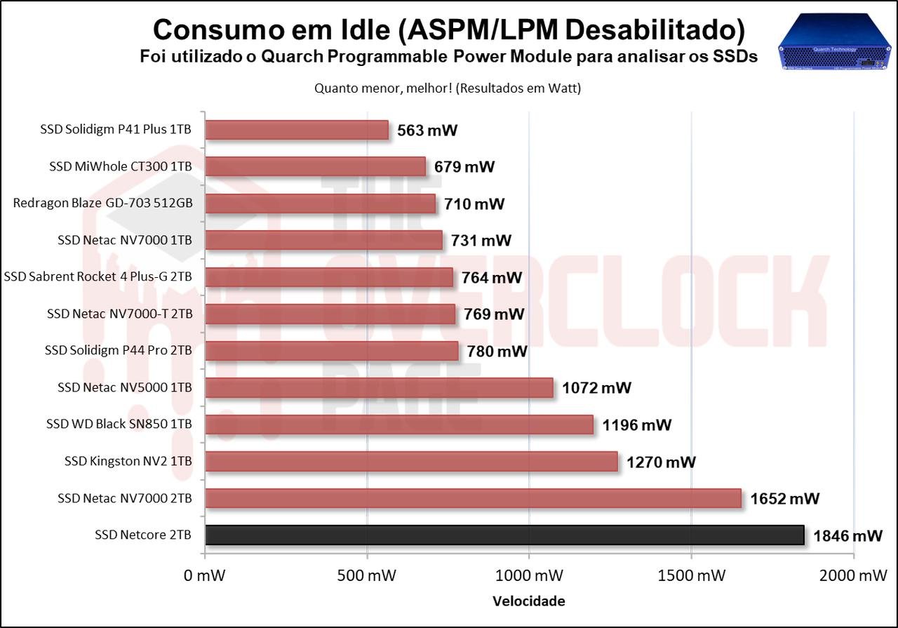 Por último e mais importante, teste em Idle, sendo o cenário em que a esmagadora maioria dos SSDs se encontram no uso do dia a dia ou cotidiano, e como já era de se esperar, estes SSDs com IG5236 na esmagadora maioria das vezes possuem um consumo elevadíssimo, ficando quase a 2W e consumo.