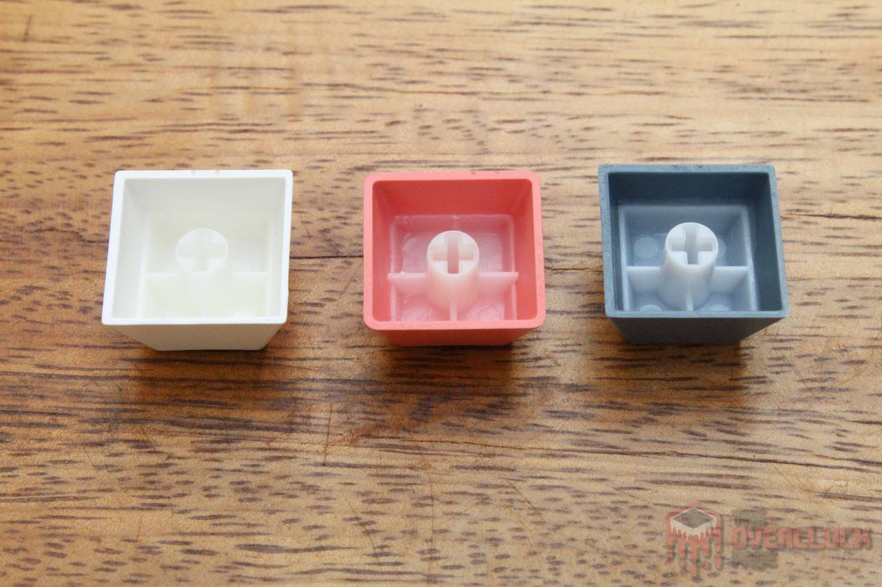 As keycaps utilizadas são de plástico PBT com impressão doubleshot, que basicamente trata-se de um processo onde a keycap é prensada em outra peça plástica transparente com o carácter e a vantagem é que esse processo anula a possibilidade delas descascarem e se tornarem ilegíveis com o tempo.