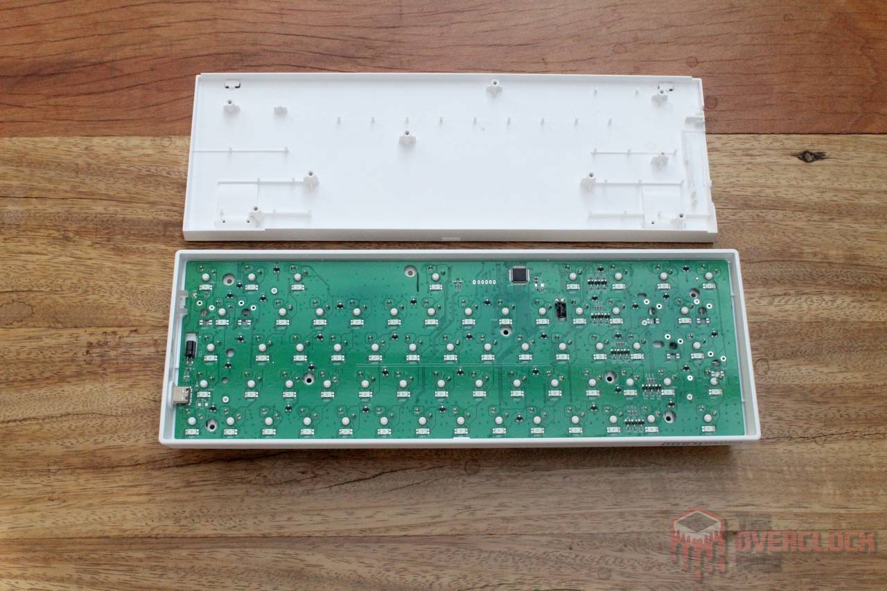 Sobre o processo de desmontagem, ele é bem simples, bastando remover apenas as keycaps necessárias para acessar os seis parafusos que unem a “baseplate” com a carcaça plástica do teclado. Abaixo é possível ver a localização desses parafusos.