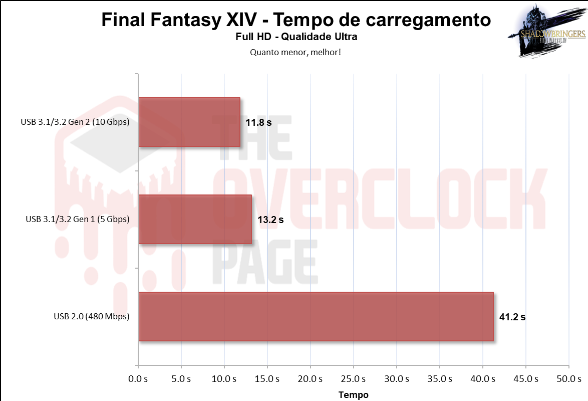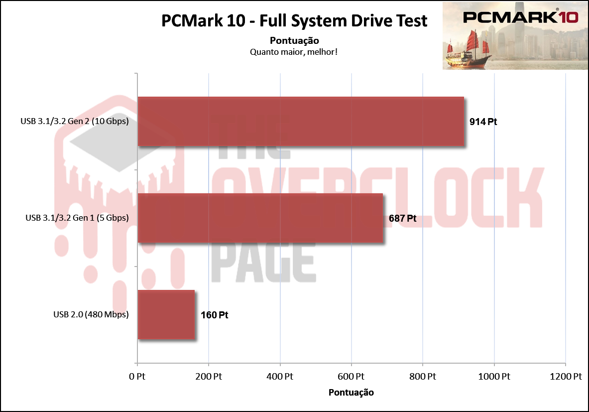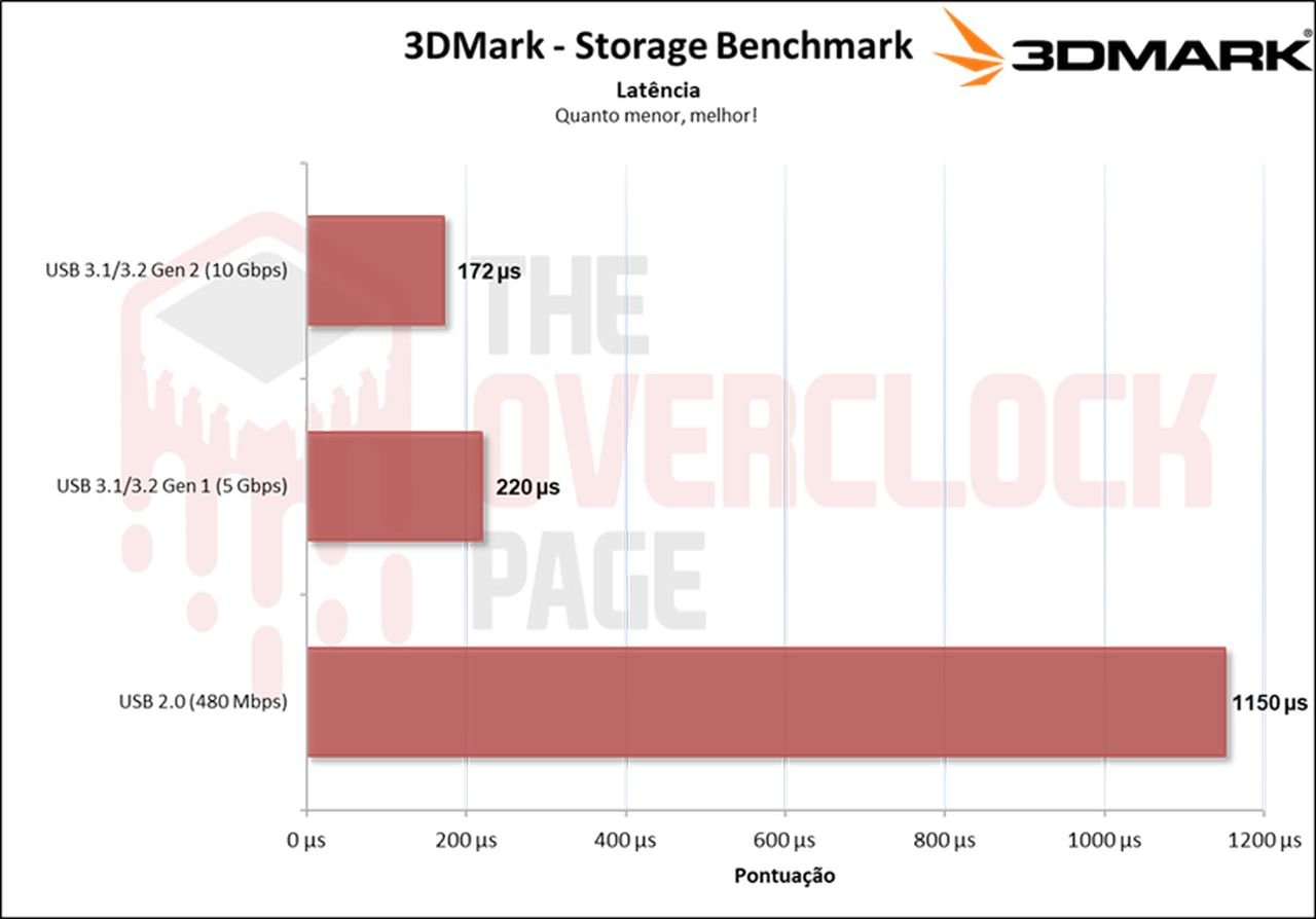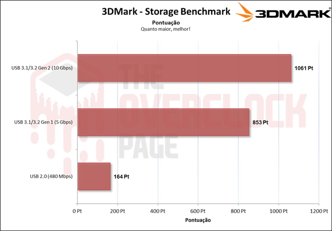 Já neste benchmark com foco em games e uso cotidiano, há uma diferença pequena ao usar no barramento de 10Gbps para 5Gbps. Houve uma diferença imensa para o barramento de 480Mbps, que o inviabiliza para atividade mais exigentes.