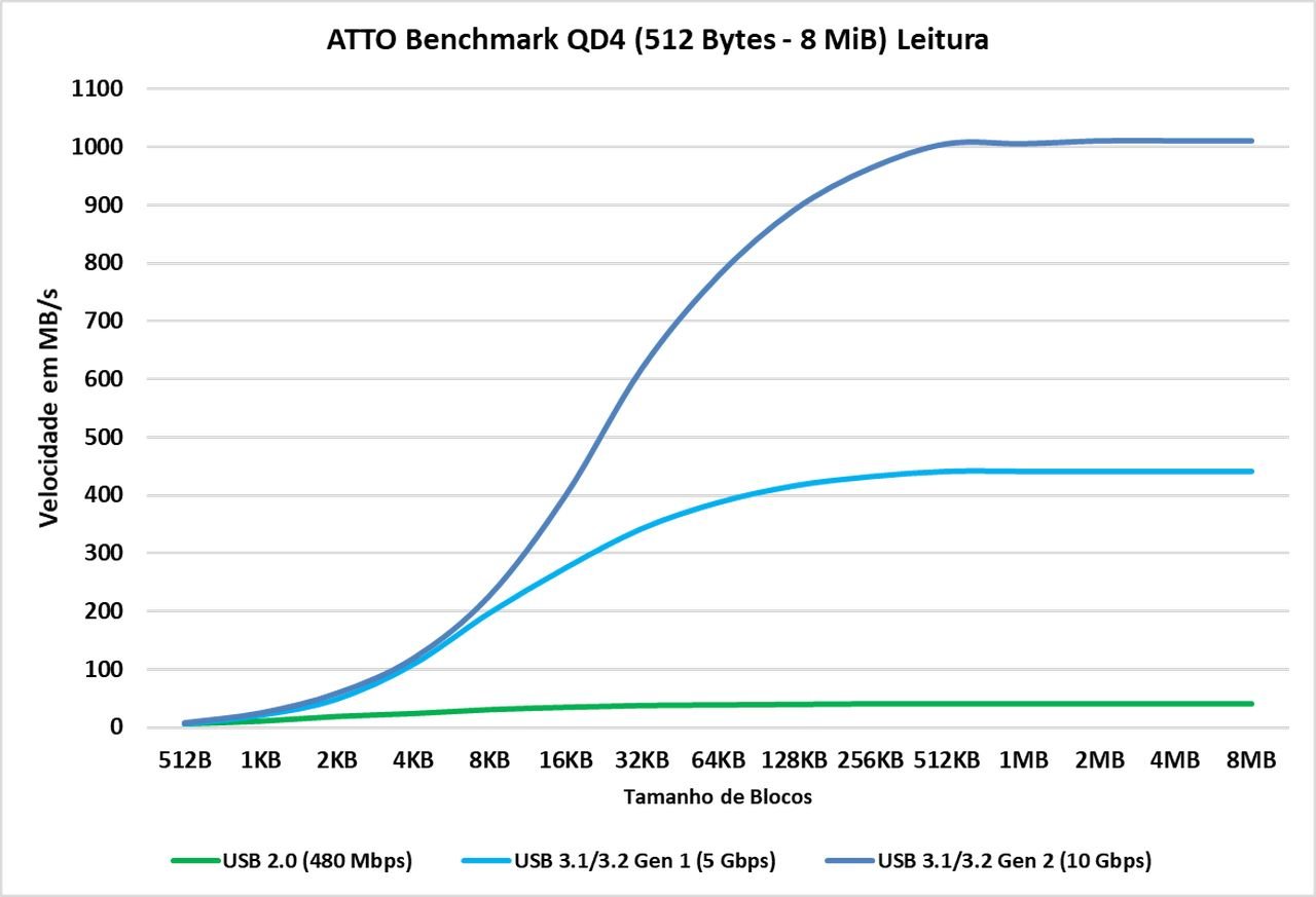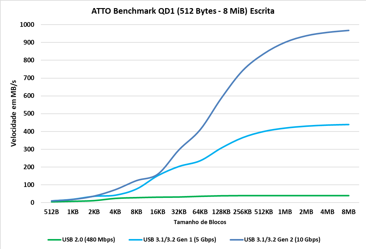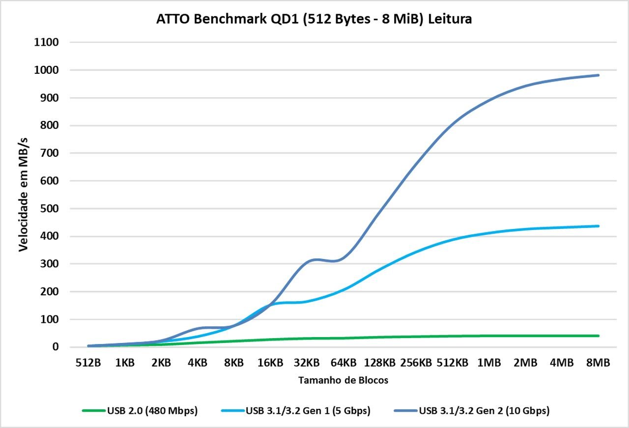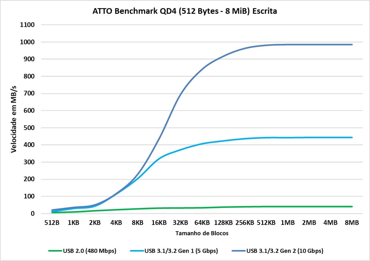 O ATTO Disk Benchmark é um software que faz um teste de velocidade sequencial com arquivos comprimidos, ou seja, para uma simulação em uma carga de transferência de dados como no Windows, geralmente vemos algo em torno dos blocos de 128KB à 1 MiB, agora, vemos que este SSD externo consegue tanto em sua leitura e escrita entregar seu barramento de 1GBps a partir de blocos de 128 KiB, enquanto na USB 3.0 ele já consegue saturar o barramento a 64 KiB.