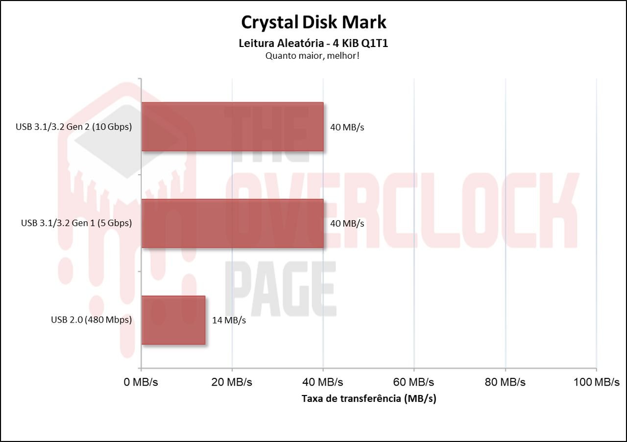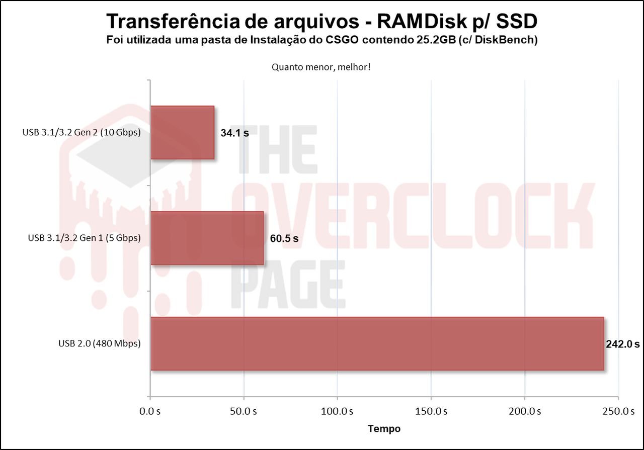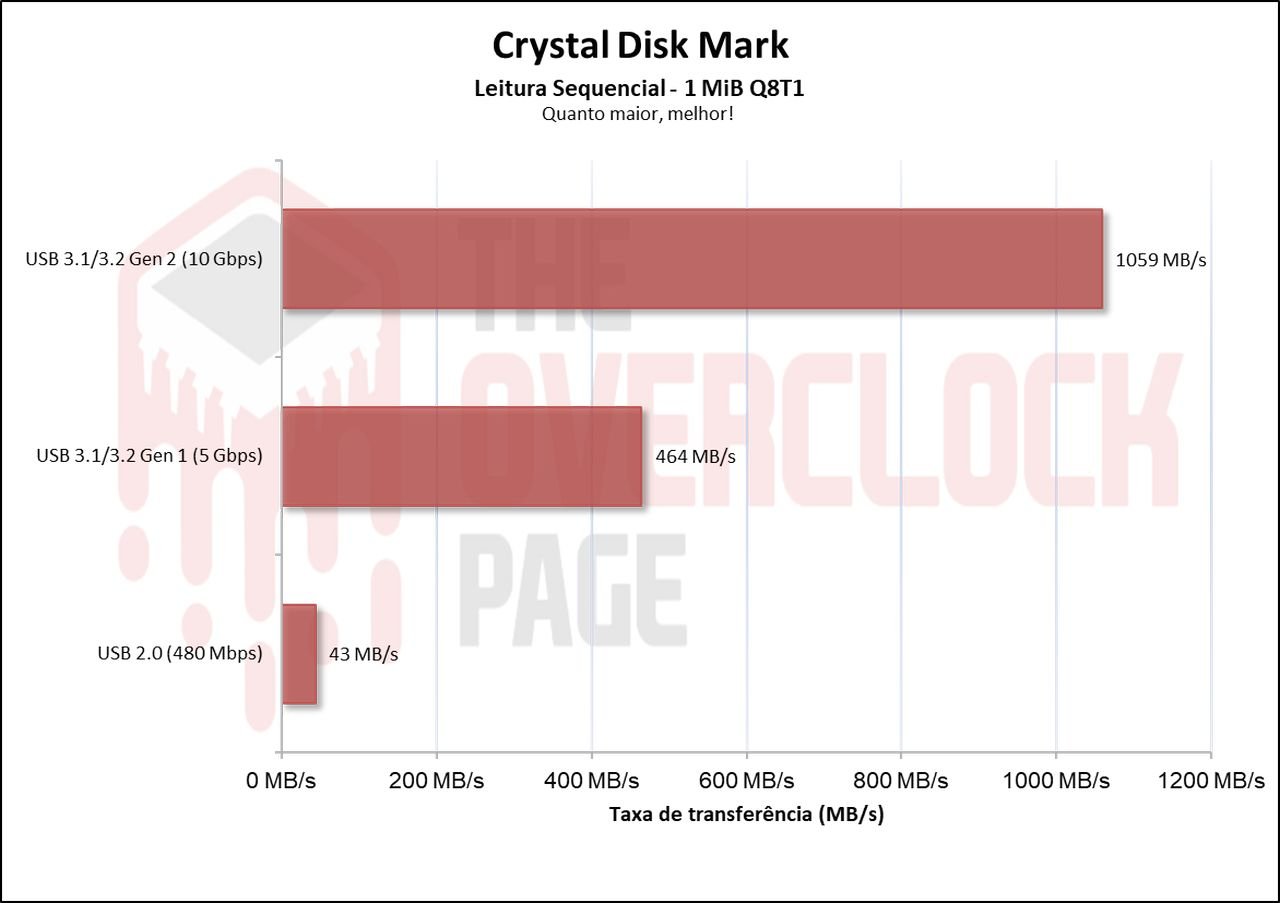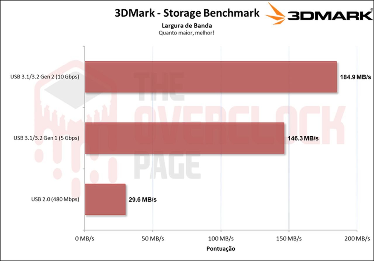Neste cenário, que é um benchmark prático com foco um pouco maior em escrita do que o 3DMark, vemos novamente que há sim uma diferença para esses 2 conectores USBs de 5 e 10Gbps de aproximadamente 33% porém, a diferença para USB 480Mbps é absurda.
