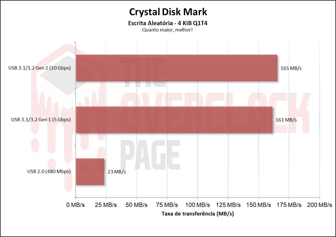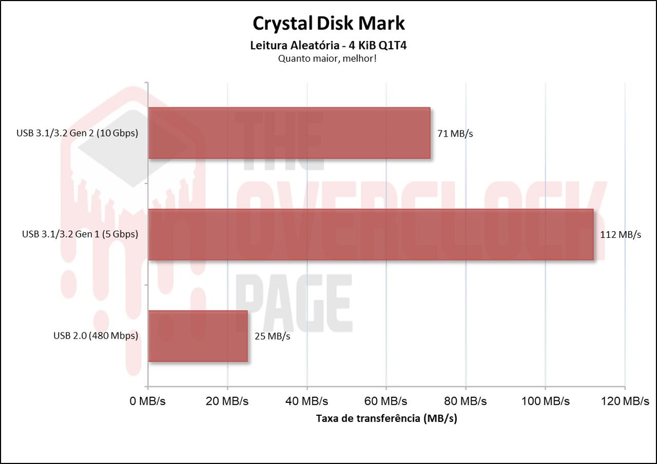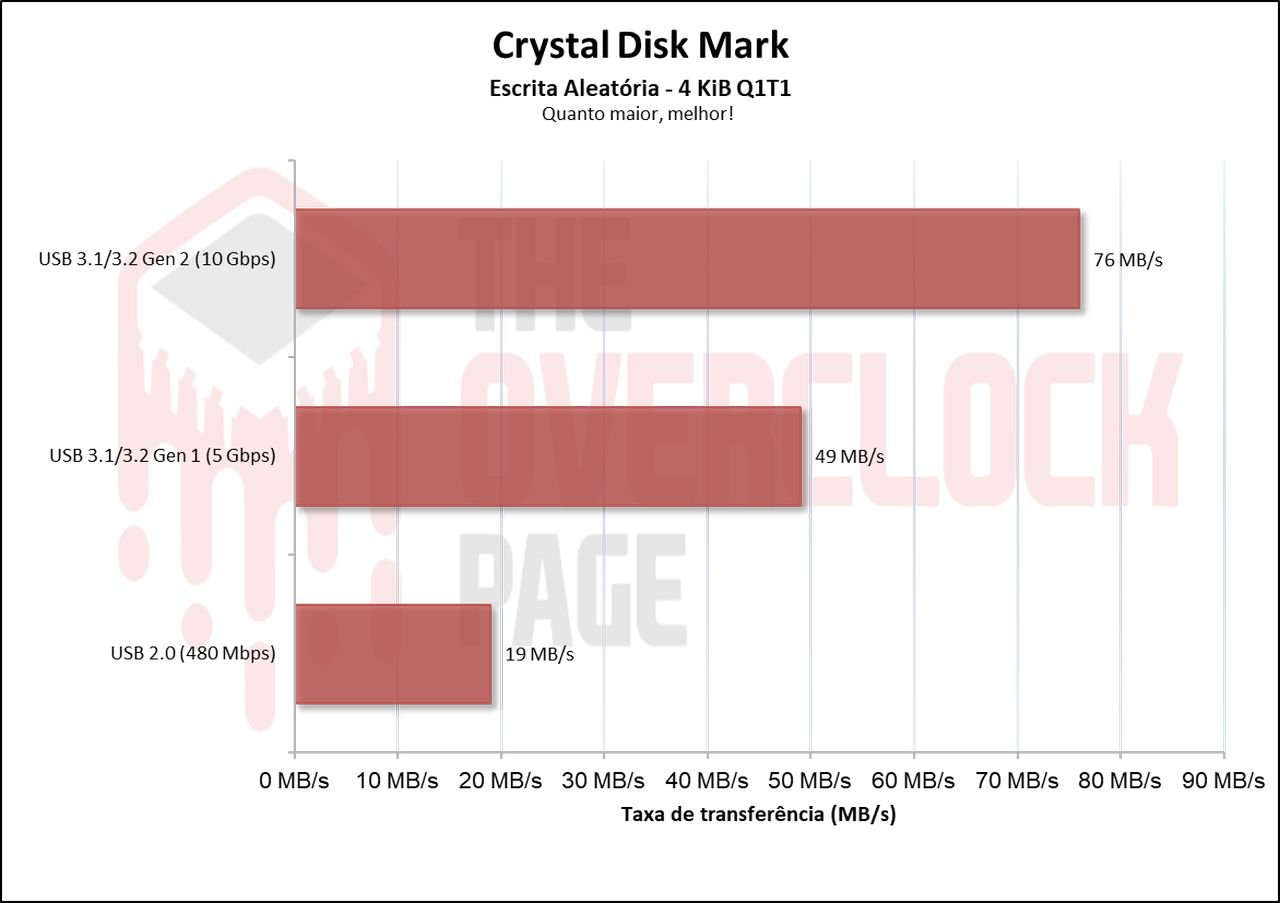 Neste cenário, que é um benchmark prático com foco um pouco maior em escrita do que o 3DMark, vemos novamente que há sim uma diferença para esses 2 conectores USBs de 5 e 10Gbps de aproximadamente 33% porém, a diferença para USB 480Mbps é absurda.