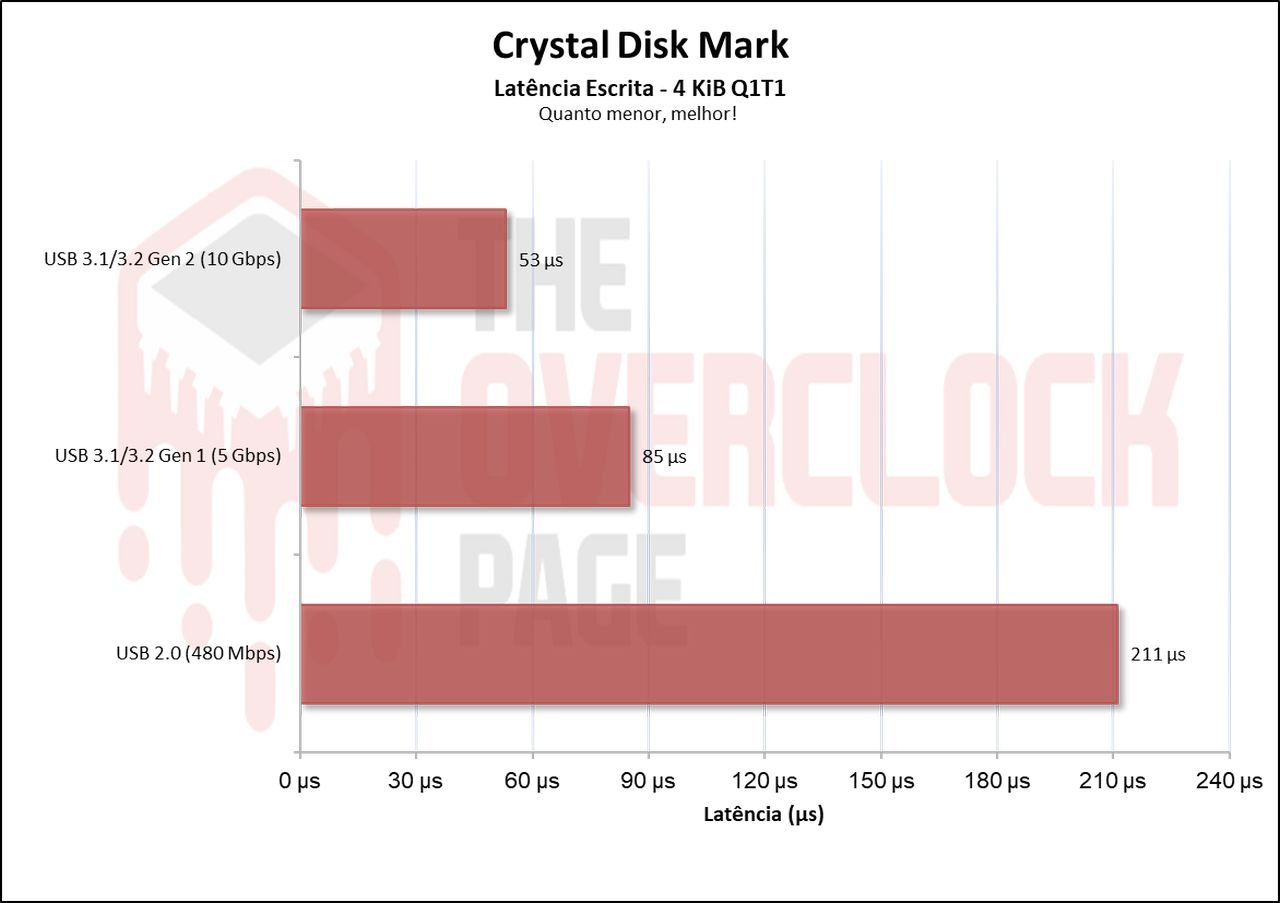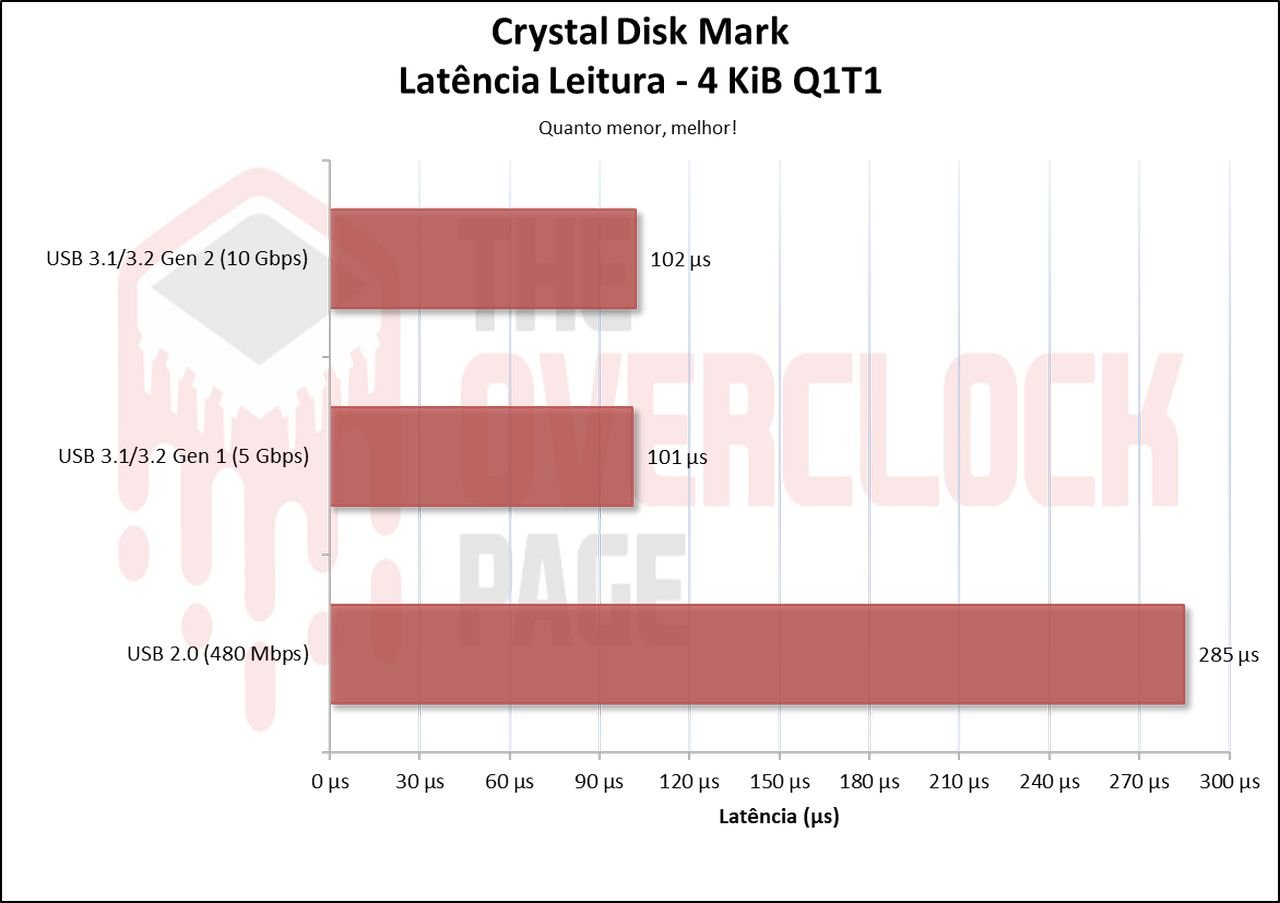 Já em suas latências, vemos que tanto em 10Gbps quanto em 5Gbps em sua leitura, eles tiveram um empate pois ambos em QD1 tem o mesmo resultado, apenas em sua escrita que há uma diferença maior entre eles. E novamente a USB 2.0 com um desempenho ridículo.