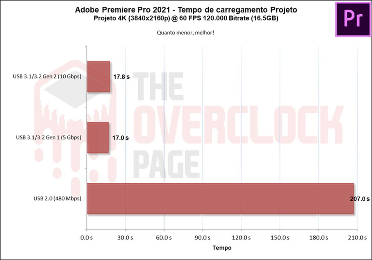 Ao utilizarmos o Premiere para carregarmos um projeto de mais de 16GB, novamente, um empate técnico com esses 2 conectores, apenas ao usarmos o barramento de 480Mbps que tem uma diferença gigantesca inviabilizando seu uso.