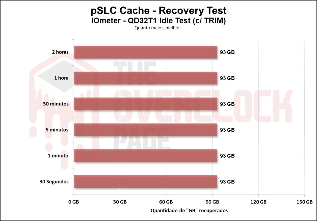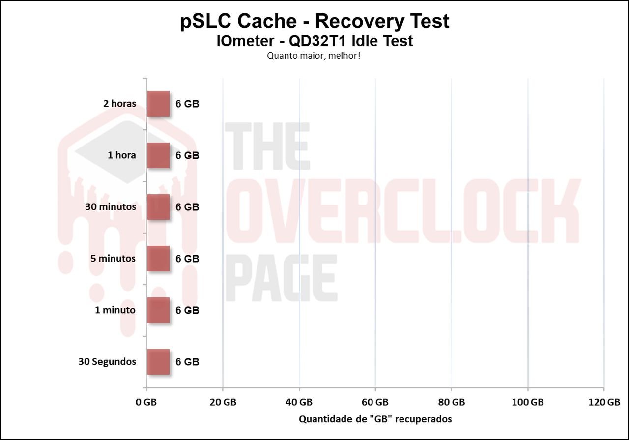 Realizamos também um teste para ver quanto tempo o SSD levaria para recuperar parte de seu Buffer e no decorrer da nossa bateria de testes, que dura de 30 segundos até 2 horas em idle, utilizando o TRIM e gargabe collection vs TRIM/GC não utilizados. Ao testarmos sem usar o TRIM/GC podemos observar que ele conseguiu recuperar cerca de 6GB o que representa o seu volume de SLC Cache estático.