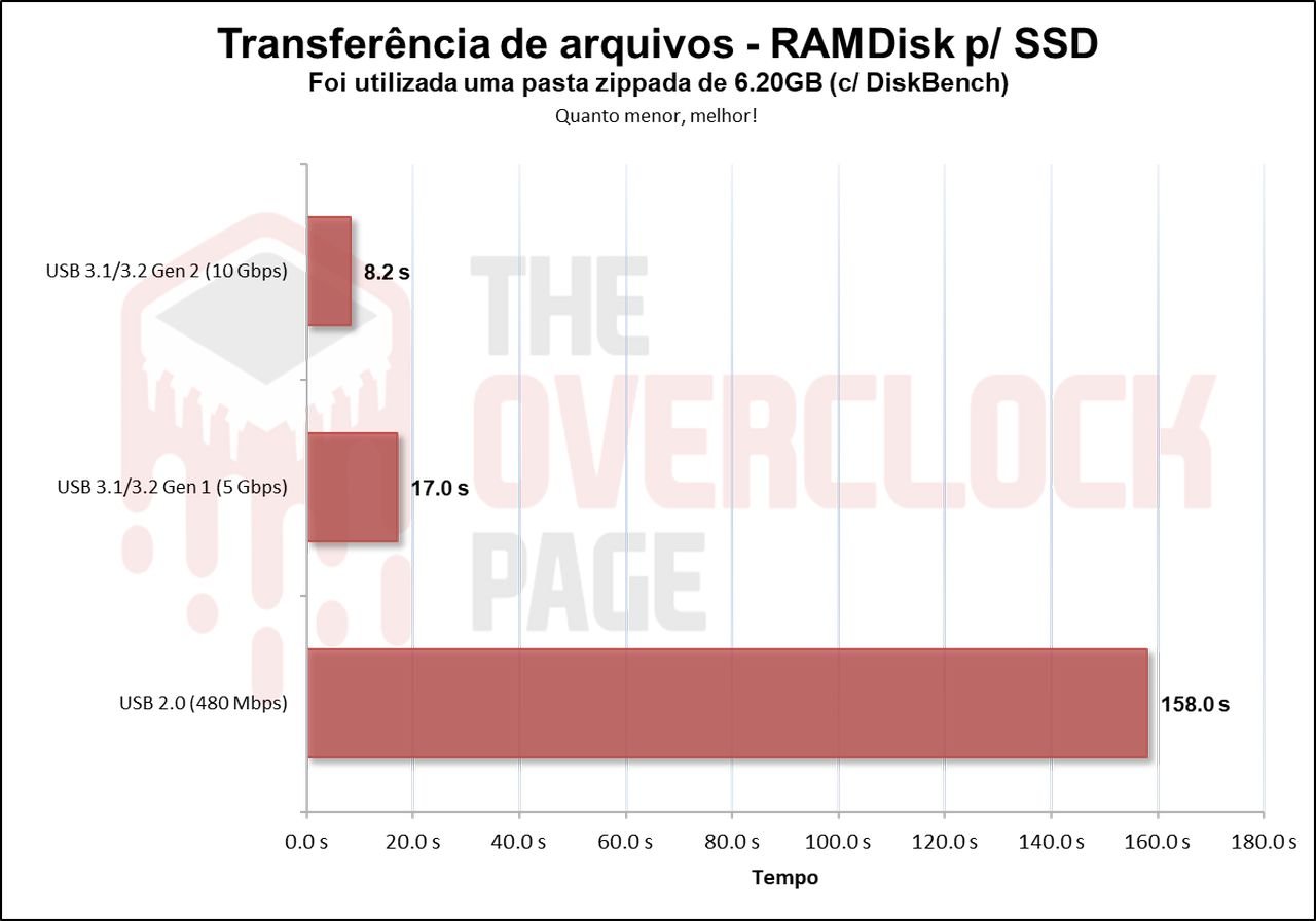 O mesmo ocorre com arquivos ou pastas de maior tamanho, até mesmo aqui a USB 3.0 de 5Gbps tem uma difereça grande para a USB de 10Gbps.