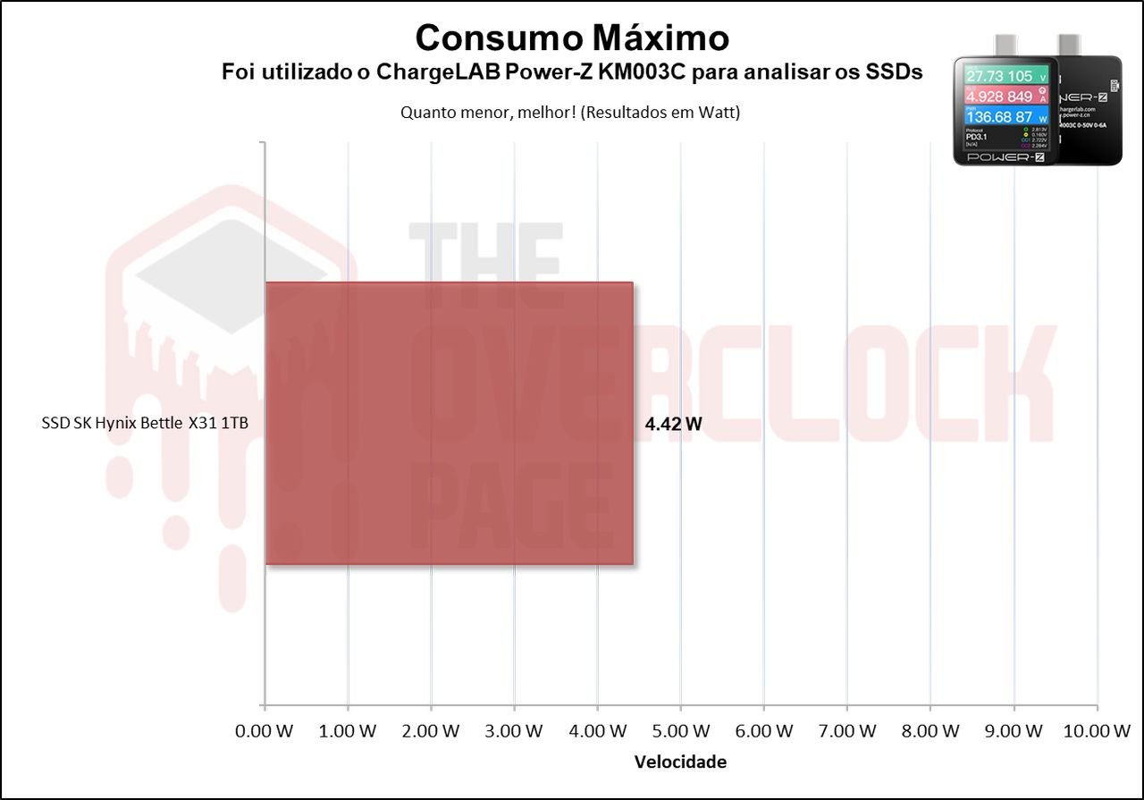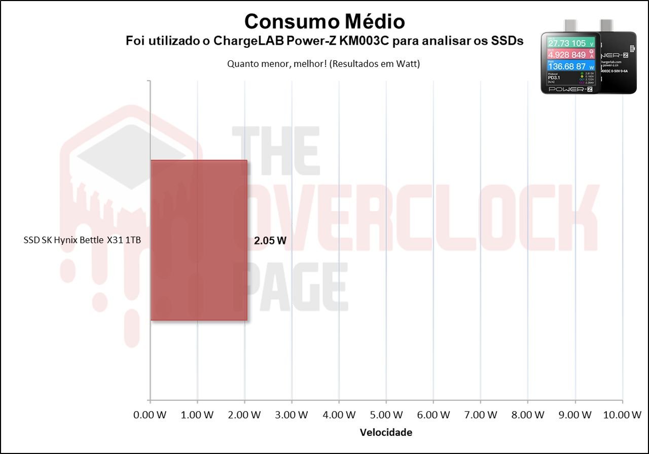 E como haviamos mencionado, na sua média ele teve um consumo próximo de 2W, o que foi um bom resultado e torna o SSD bem eficiênte.