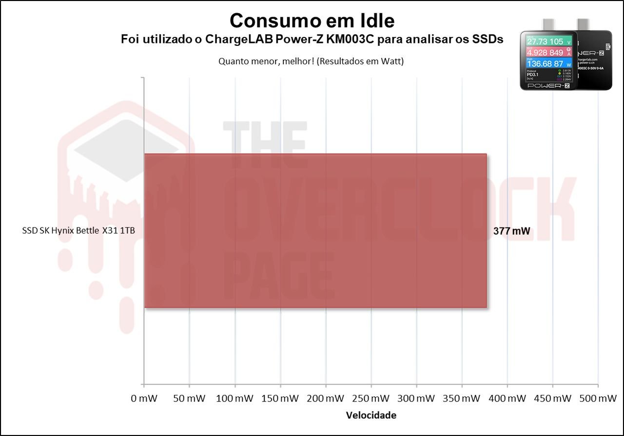 Por último e mais importante, teste em Idle, sendo o cenário em que a esmagadora maioria dos SSDs se encontram no uso do dia a dia ou cotidiano, vemos que ele apresentou uma média bem interessante de 377mW, apresantando bons resultados.