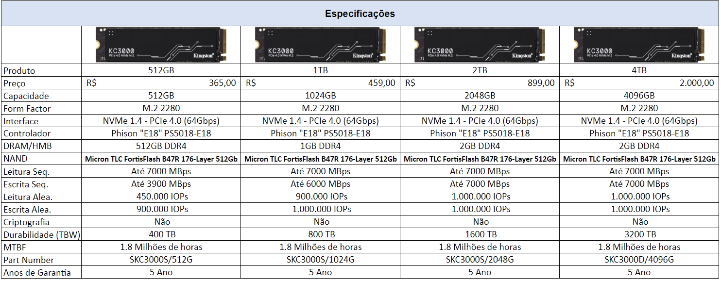 Se repararmos, o KC3000 vem em capacidades de 512GB, 1024GB, 2048GB e 4096GB, enquanto o fury vem em 500GB, 1000GB, 2000GB e 4000GB. O que simboliza que o Fury Renegade tem um alocamento de over-provisioning um pouco maior, o que acaba contribuindo, diminuindo o write-amplification, o que por sua vez ajuda aumentando sua durabilidade, e por isso vemos que o TBW do Fury Renegade é um pouco maior, mesmo que ambos os SSDs tenham a mesma configuração em termos de hardware.