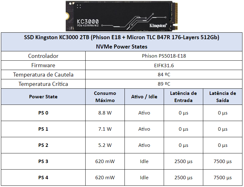 Podemos observar que tanto este SSD quanto o Fury Renegade possuem os mesmos parâmetros de power states, com mesmo valores de consumo e suas devidas latências. e até mesmo suas temperaturas de cautela e proteção. O SSD começa a sofrer thermal throttling a partir de 84ºC, que foi o ponto na qual o fabricante configurou.