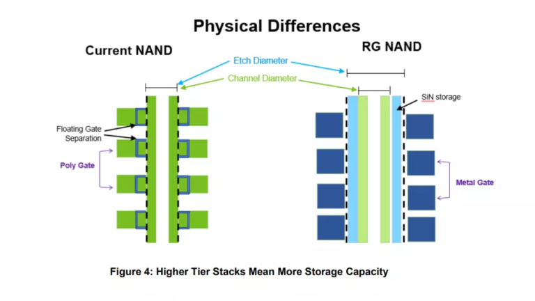 Outra inovação que eles fizeram foi que eles conseguiram diminuir bem a complexidade nos processos de “programming” e até mesmo o Overhead graças a troca dos Silicon Gates que costumavam usar Polysilicon, agora usam apenas metal, junto disto estão usando outra técnica de “Etching“ que seria a furação que eles utilizam para colocar os circuitos e strings, diminuindo a resistência.