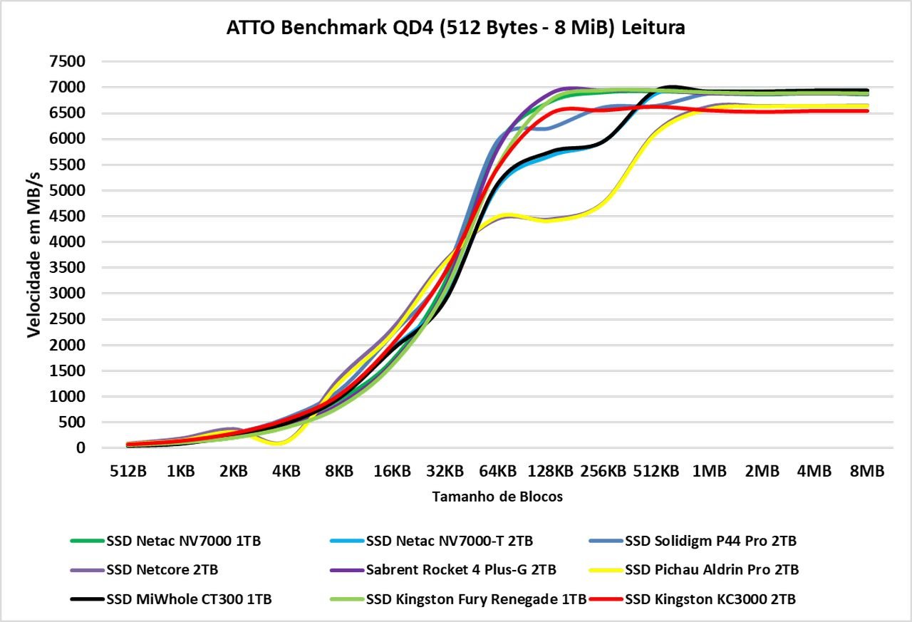 O ATTO Disk Benchmark é um software que faz um teste de velocidade sequencial com arquivos comprimidos, ou seja, para uma simulação em uma carga de transferência de dados como no Windows, geralmente vemos algo em torno dos blocos de 128KB à 1 MiB, agora, na leitura vemos outro empate entre o KC3000 e o Fury Renegade que também tiveram desempenho semelhante aos demais SSDs com Phison E18 como os Sabrent.