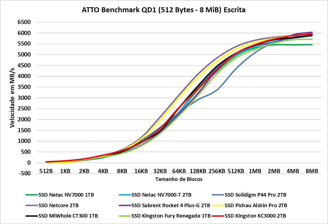 Realizamos um teste utilizando o ATTO para observar a velocidade dos SSDs em determinados tamanhos de blocos diferentes. Neste benchmark, foi configurado da seguinte forma:
