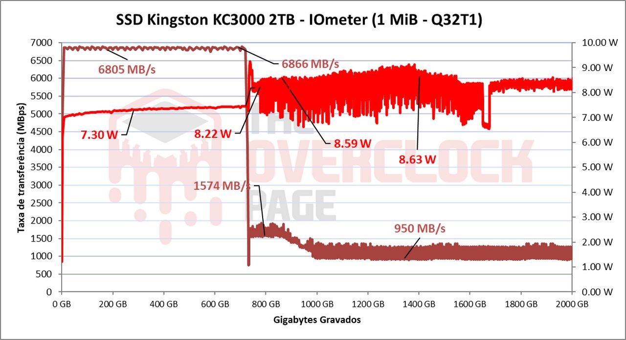 Através do IOmeter, podemos ter uma ideia do volume de SLC cache deste SSD, já que o fabricante muita vezes não informa este valor. Pelos testes que realizamos, foi possível constatar que ele possui um volume de pSLC Cache que aparenta ser dinâmico, imenso, de cerca de 731GB, ele conseguiu manter velocidade média de ~ 6766MB/s até o fim do buffer, o que foi uma velocidade boa considerando que essa é uma unidade SSD PCIe 4.0 de 2TB com 32 dies.