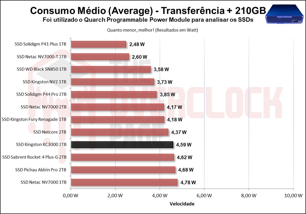 O SSD teve uma eficiência “OK”, não chegou a ser a maior do comparativo, pois embora a sua largura de banda tenha sido bem elevada, seu consumo também foi, o que acaba diminuindo um pouco sua pontuação final.