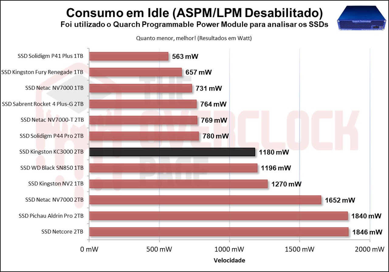 Por último e mais importante, teste em Idle, sendo o cenário em que a esmagadora maioria dos SSDs se encontram no uso do dia a dia ou cotidiano, e curiosamente notamos que ele teve um consumo maior do que o esperado, aonde em Idle ele ficou quase em 1.2W enquanto o Fury Renegade teve um consumo quase que metade do KC3000.