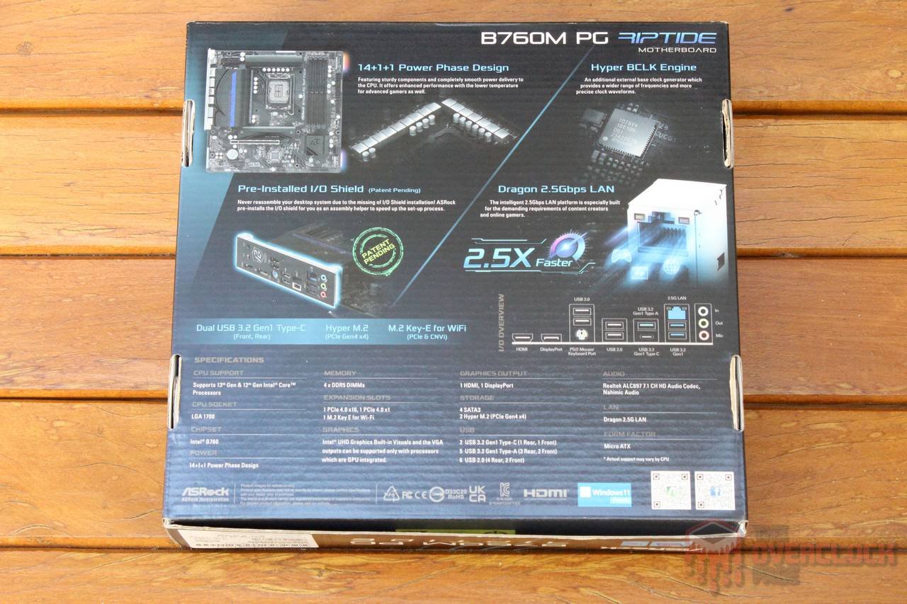 A respeito da caixa, na parte da frente, consta um brasão da série “PG Riptide”, além do modelo da placa e destaque a alguns features como o “Polychrome Sync” e o suporte aos processadores de última geração, enquanto na traseira, existe uma tabela com as especificações, detalhes sobre o VRM, I/O Shield pré-instalado, gerador de clock externo e LAN 2.5 Gbps.