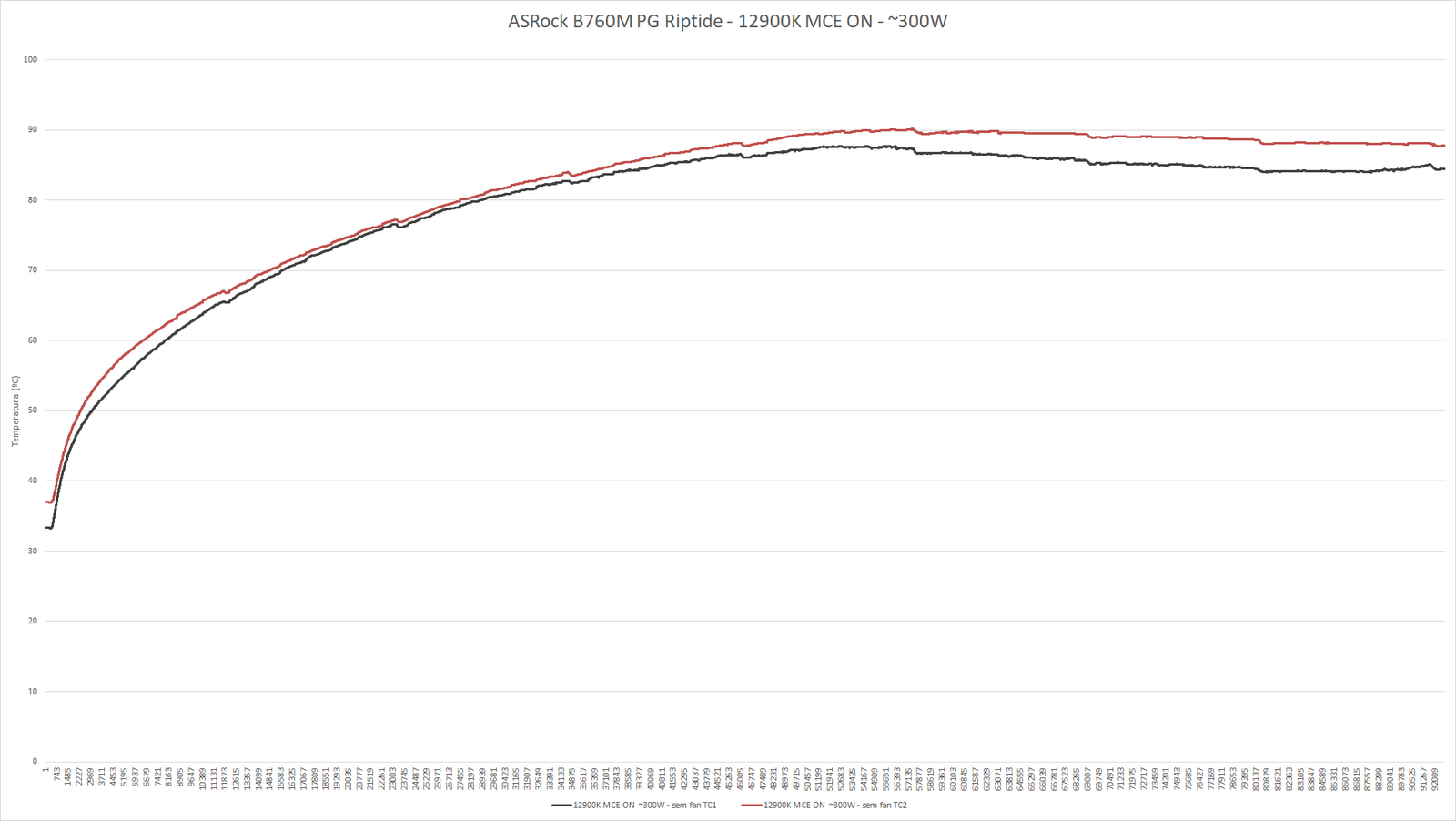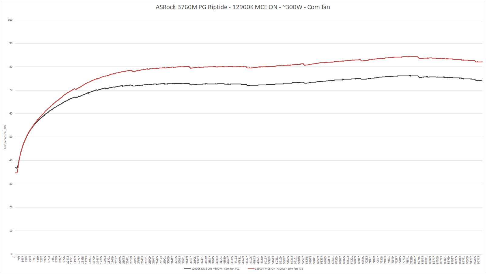 Já era de es esperar que a B760M PG Riptide não fosse ter problemas para levar o i9 12900K com MCE ligado e limites de corrente desativados, ambas situações que puxam a CPU para a casa dos 300W em load, afinal, trata-se exatamente do mesmo projeto de VRM e dissipador da B660M PG Riptide, com a B760 apresentando resultados ligeiramente superiores a sua antecessora, o que pode ser explicado pelas variações de qualidade dos componentes ou mesmo pela leve diferença no posicionamento dos termopares entre os testes.