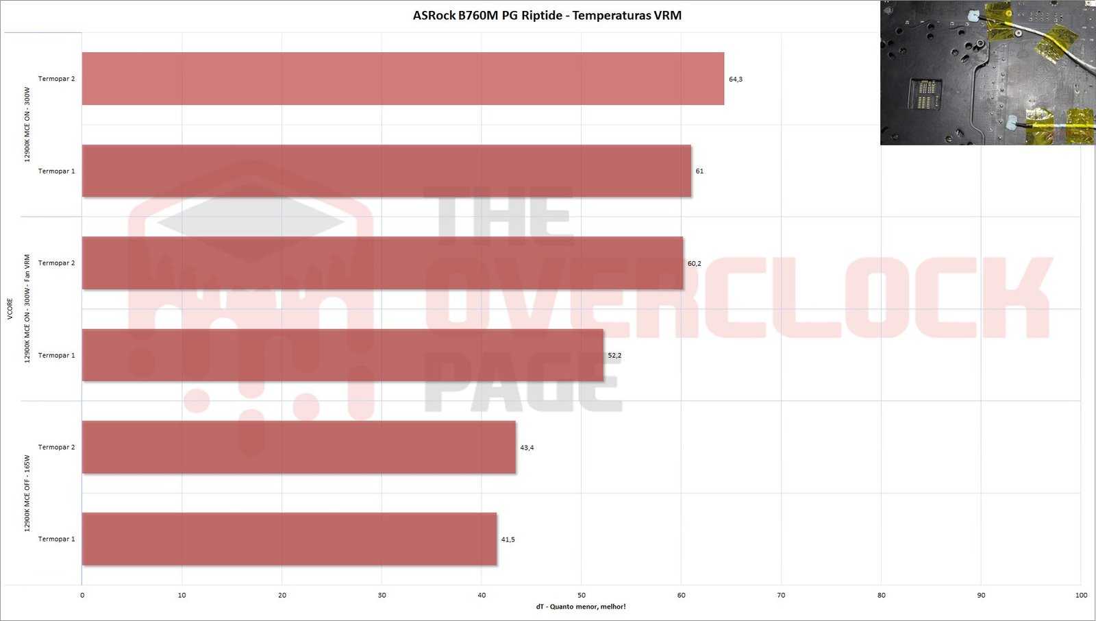Para verificar a temperatura do VRM, foi instalado um termopar tipo K com um thermalpad grudento na parte de trás da placa, logo abaixo de uma das fases, conforme mostra a foto abaixo.