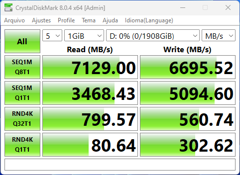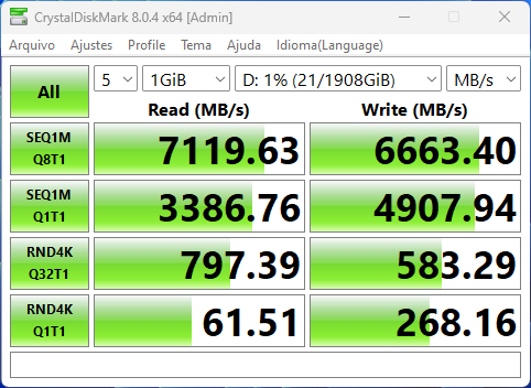 Para verificar o desempenho das M.2 e SATA, foi utilizado o Crystalmark 8.0.4, onde a ideia aqui é testar se o fabricante fez boa implementação dessas interfaces, usando unidades SATA e NVMe capazes de chegar ao limite da banda oferecida por esses barramentos.