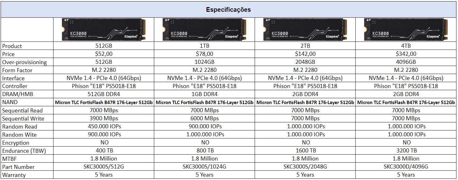 It comes in the M.2 format with a 64Gbps interface, meaning 4 PCIe 4.0 lanes, NVMe 1.4 protocol, and capacities ranging from 512GB to 4TB. Its price hovers around U$142 to U$150 for the 2TB unit, which will be tested.