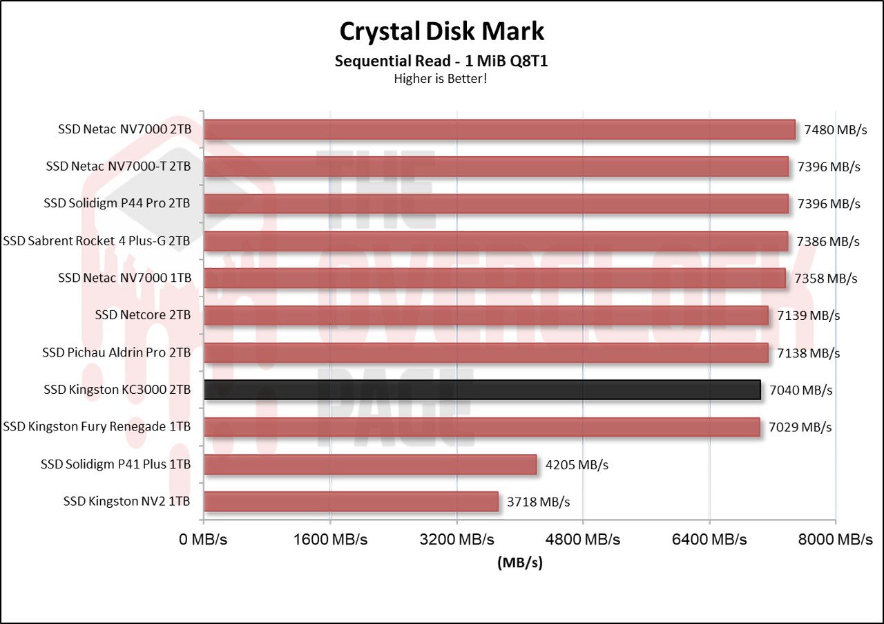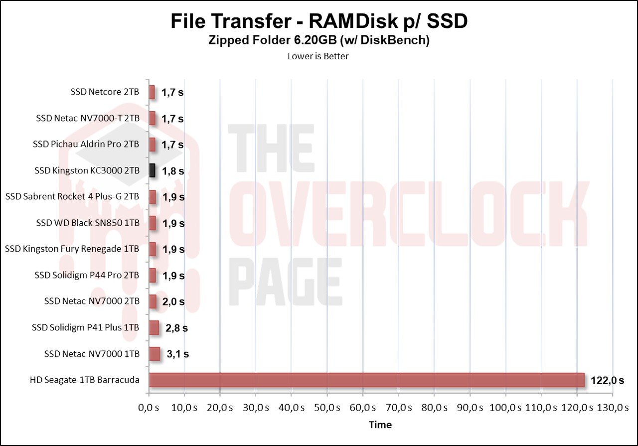 In this scenario, which is a practical benchmark with a slightly greater focus on writing than the 3DMark, we once again see the KC3000 taking the lead. This is likely due to its larger capacity, allowing for more significant parallelism.
