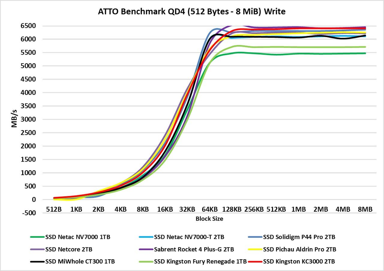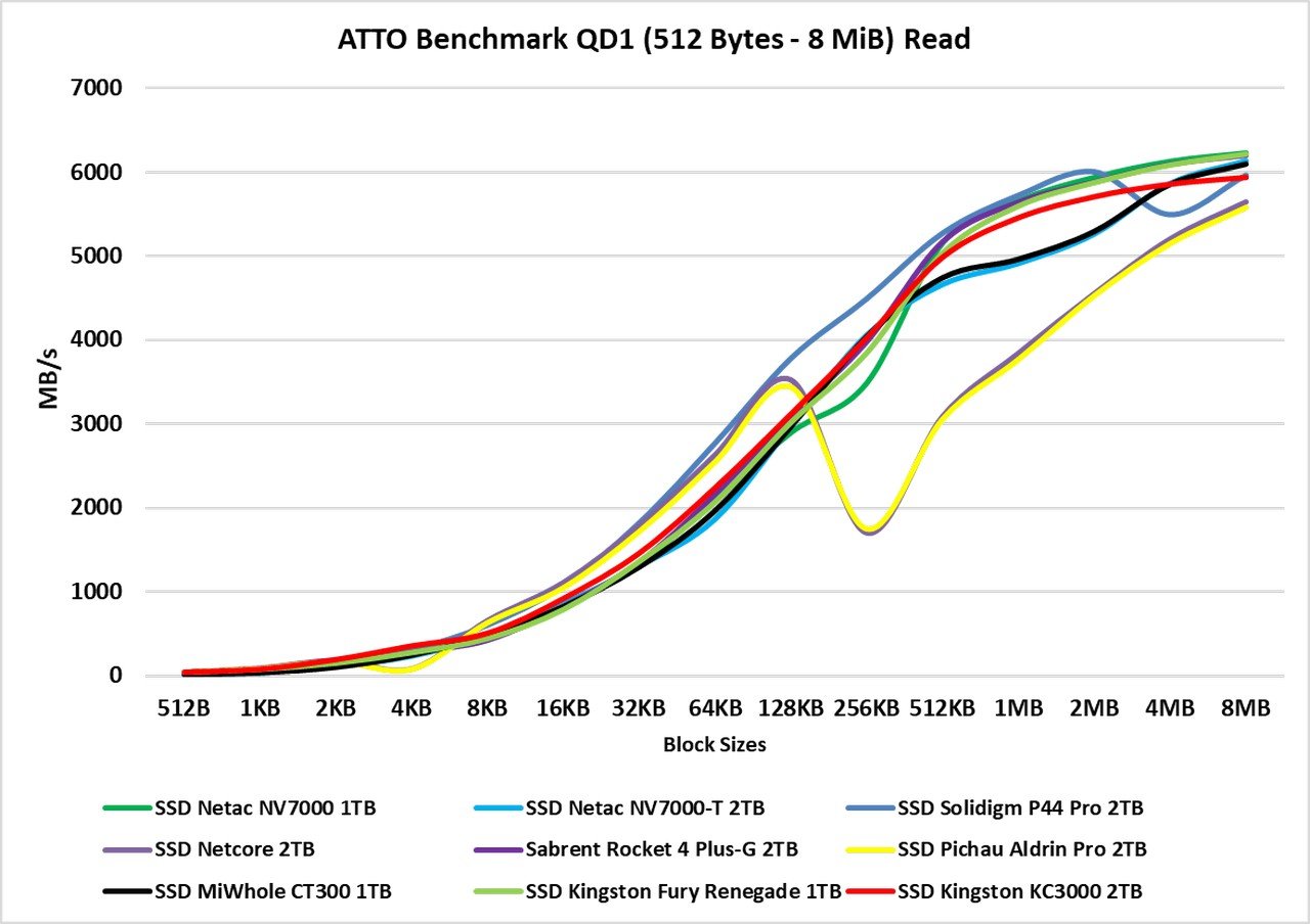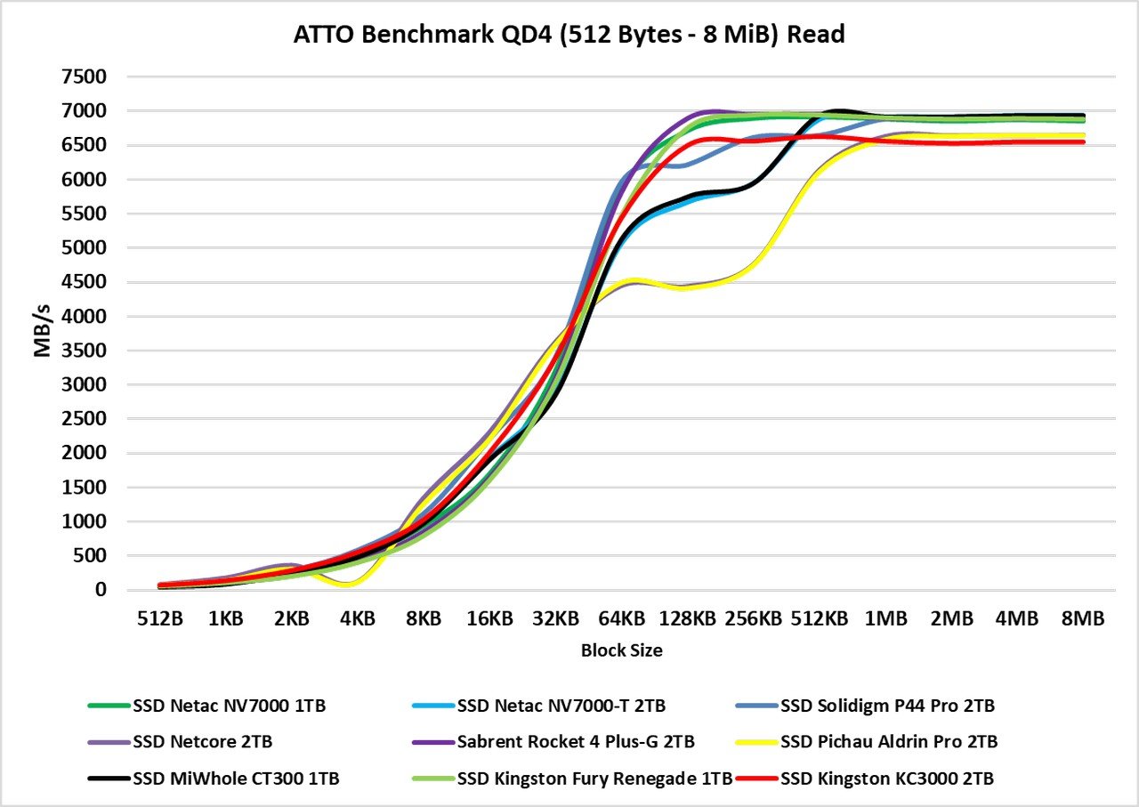 The ATTO Disk Benchmark is software that performs a sequential speed test with compressed files, simulating a data transfer load similar to that in Windows. Typically, we observe block sizes ranging from 128KB to 1 MiB. In the reading test, we again see a tie between the KC3000 and the Fury Renegade, both exhibiting performance similar to other SSDs with the Phison E18 controller, such as the Sabrent drives.