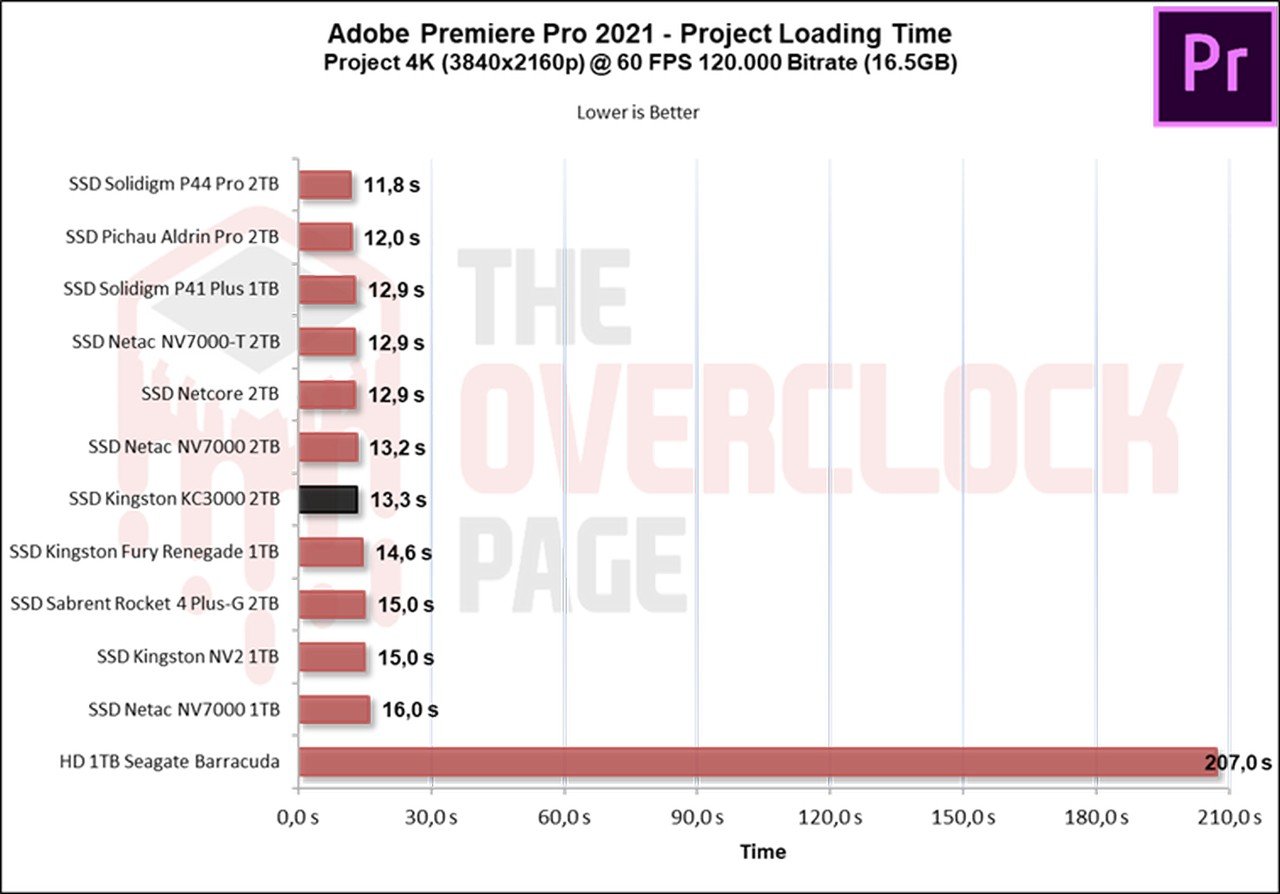 When using Premiere to load a project of over 16GB, we can see that the difference between one SSD and the other was just over 1 second, which is not much. Only in scenarios where projects are several times larger can we expect to feel a more significant difference.